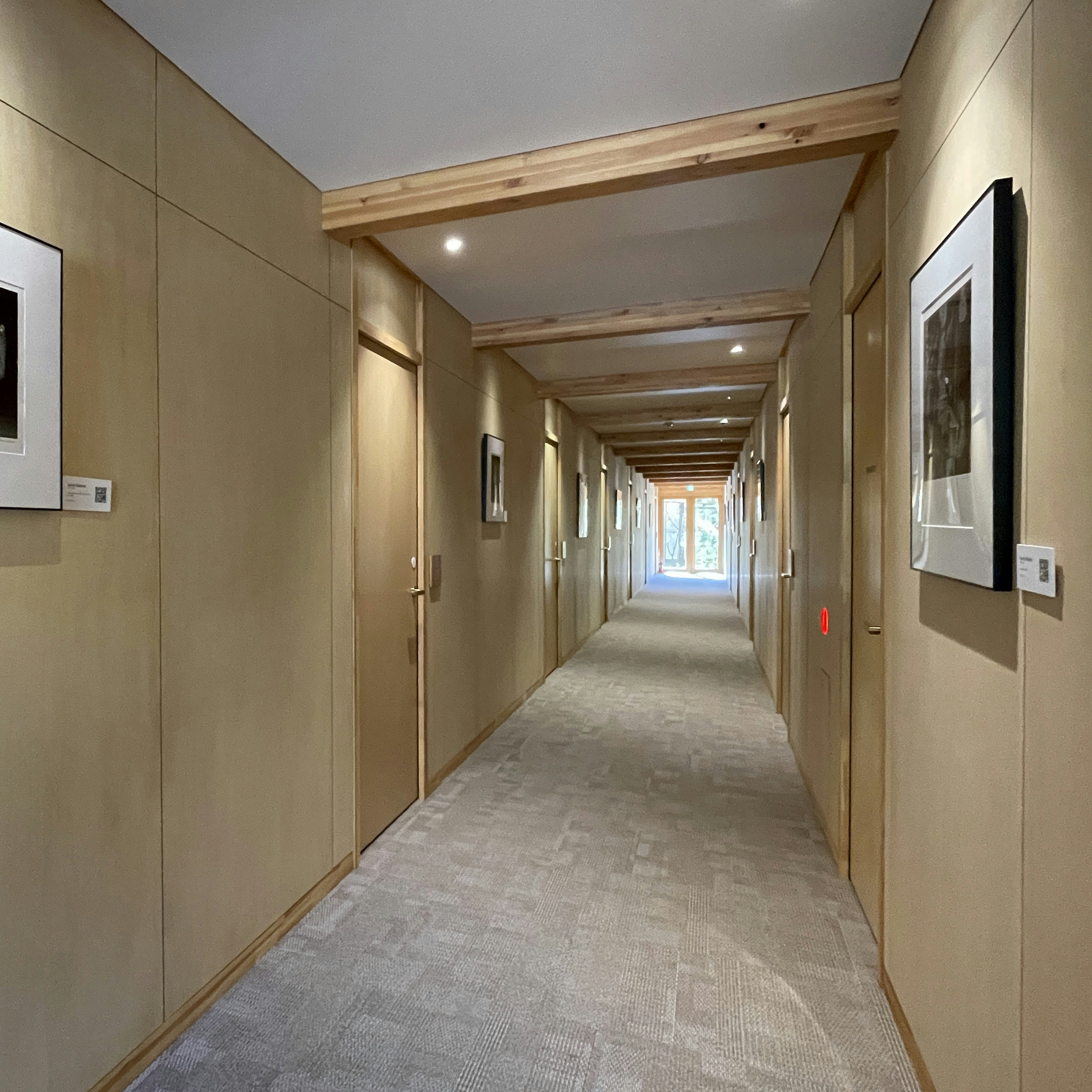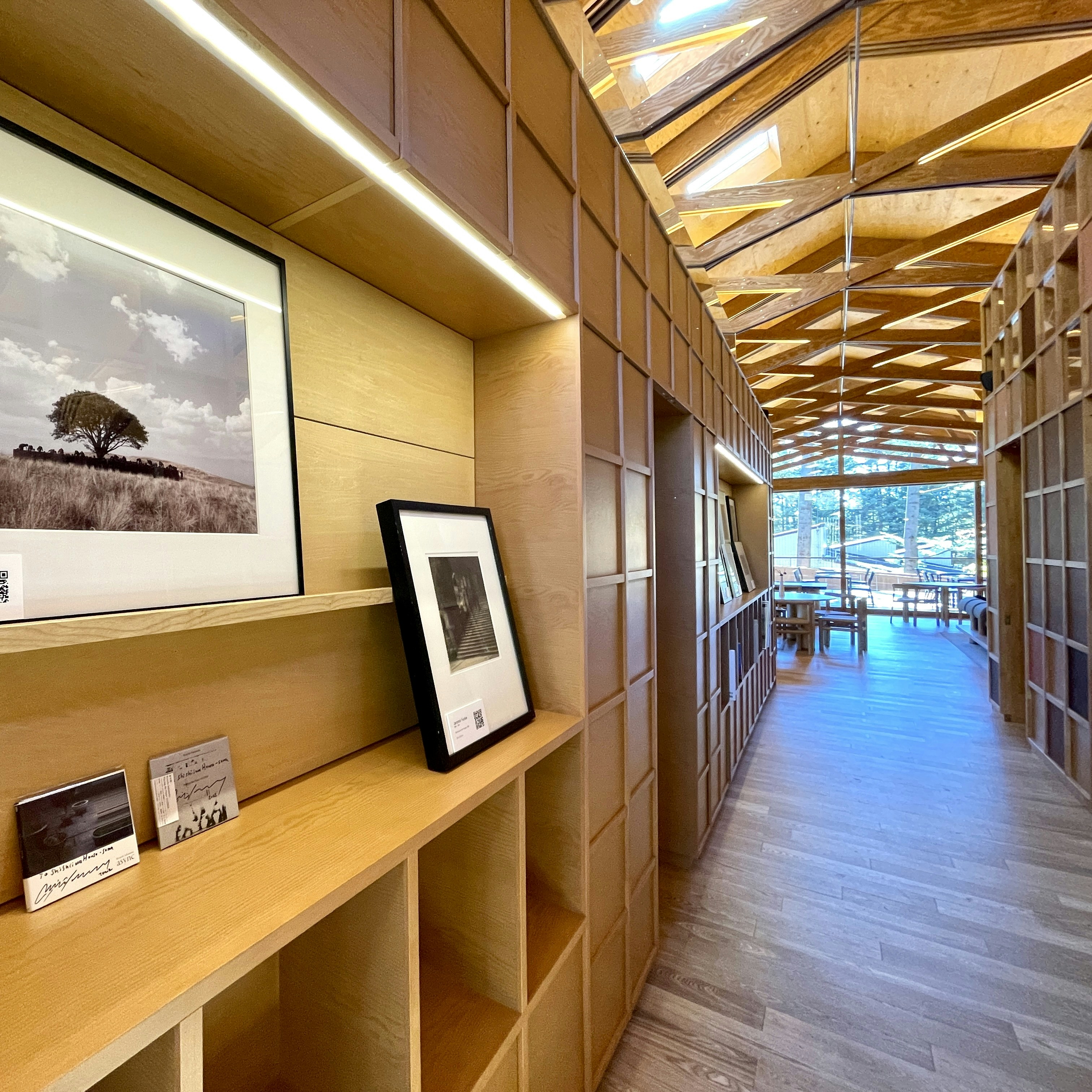 ホテルは、2019年オープンの「ししいわハウス軽井沢No.1(SSH No.1)」と、今年7月オープンの「ししいわハウス軽井沢No.2(SSH No.2)」の2棟からなる。このホテルを特徴づける重要な要素が、坂茂の建築と館内随所に展示されたアートだろう。今回はこの2大要素を中心に、内部をご紹介したい。