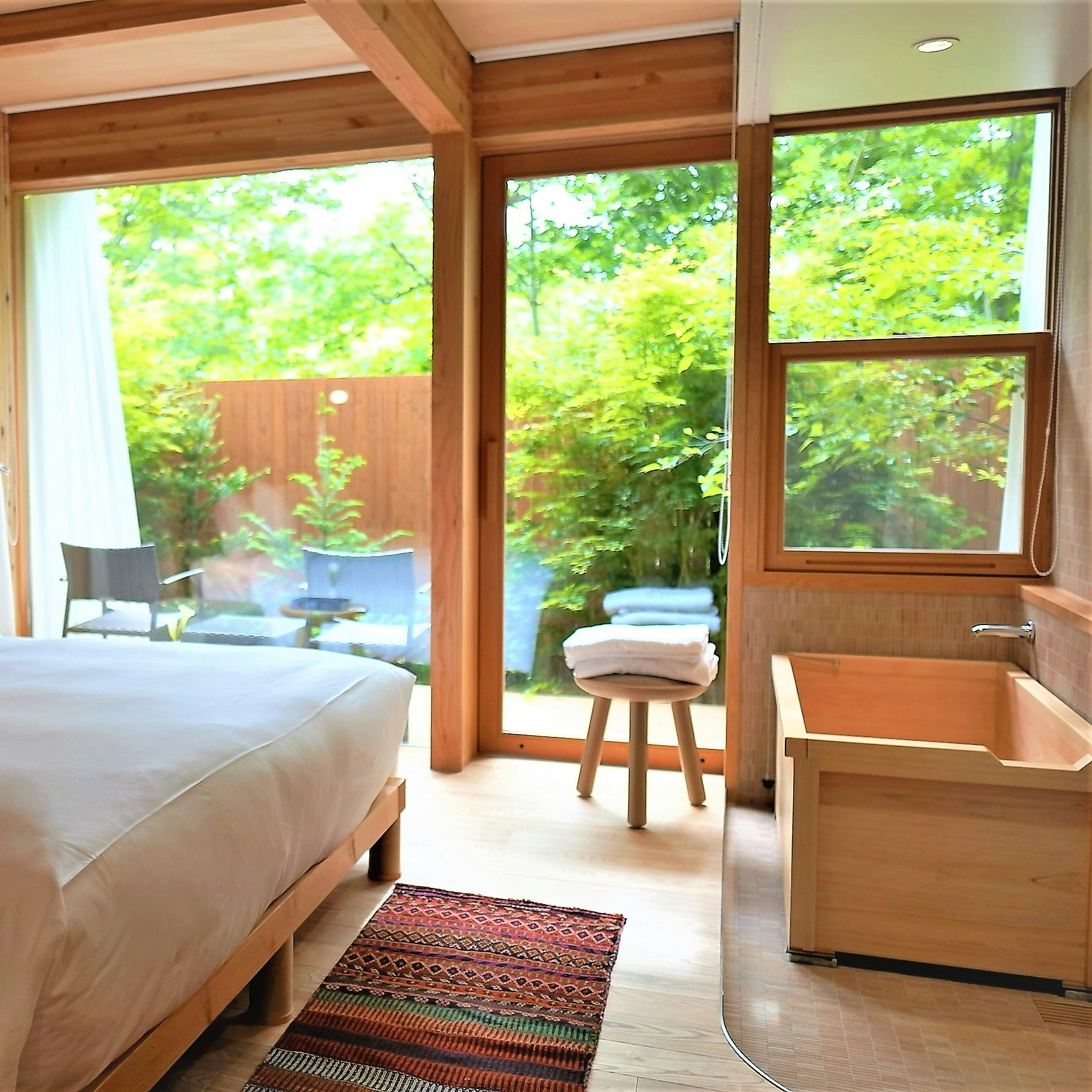 2019年にオープンした「SSH No.1」は軽井沢の豊かな景観を守るため、木々の間を縫うように設計され、滑らかな曲線が印象的な2階建ての隠れ家的建築。3つのテラス・ヴィラからなる全11室で構成されている。