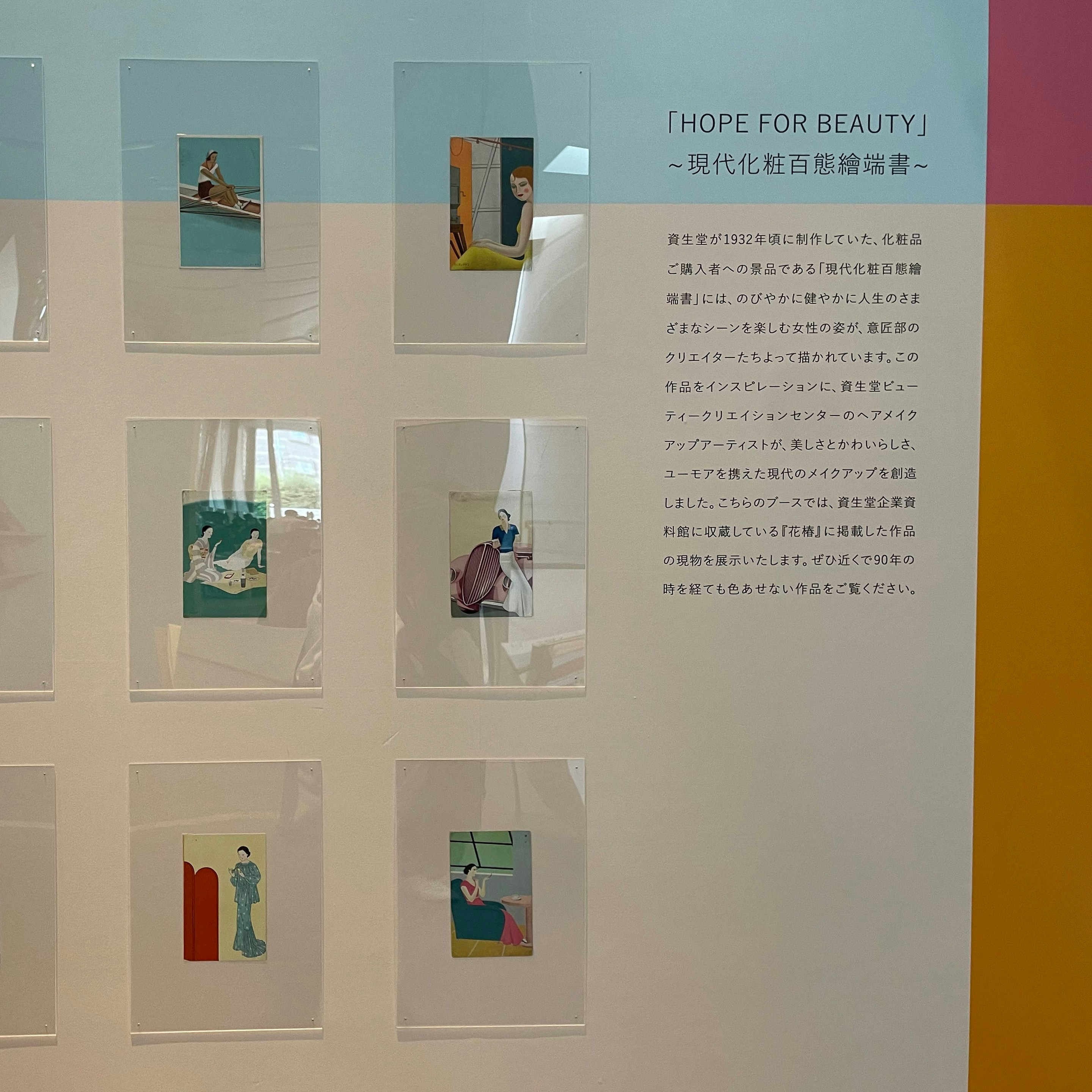 今回、会場では3つの展示ブースも設置されている。ひとつめは資生堂による「『花椿』資生堂創業150周年記念号 Special Exhibition」だ。『花椿』記念号の配布に加えて、資生堂が1932年頃に制作していた購入者特典「現代化粧百態繪端書」をインスピレーションに、資生堂のヘアメイクアップアーティストが現代風に再解釈したビジュアルも展示。「現代化粧百態繪端書」の現物も展示されているため、比べてみるのも面白いだろう。