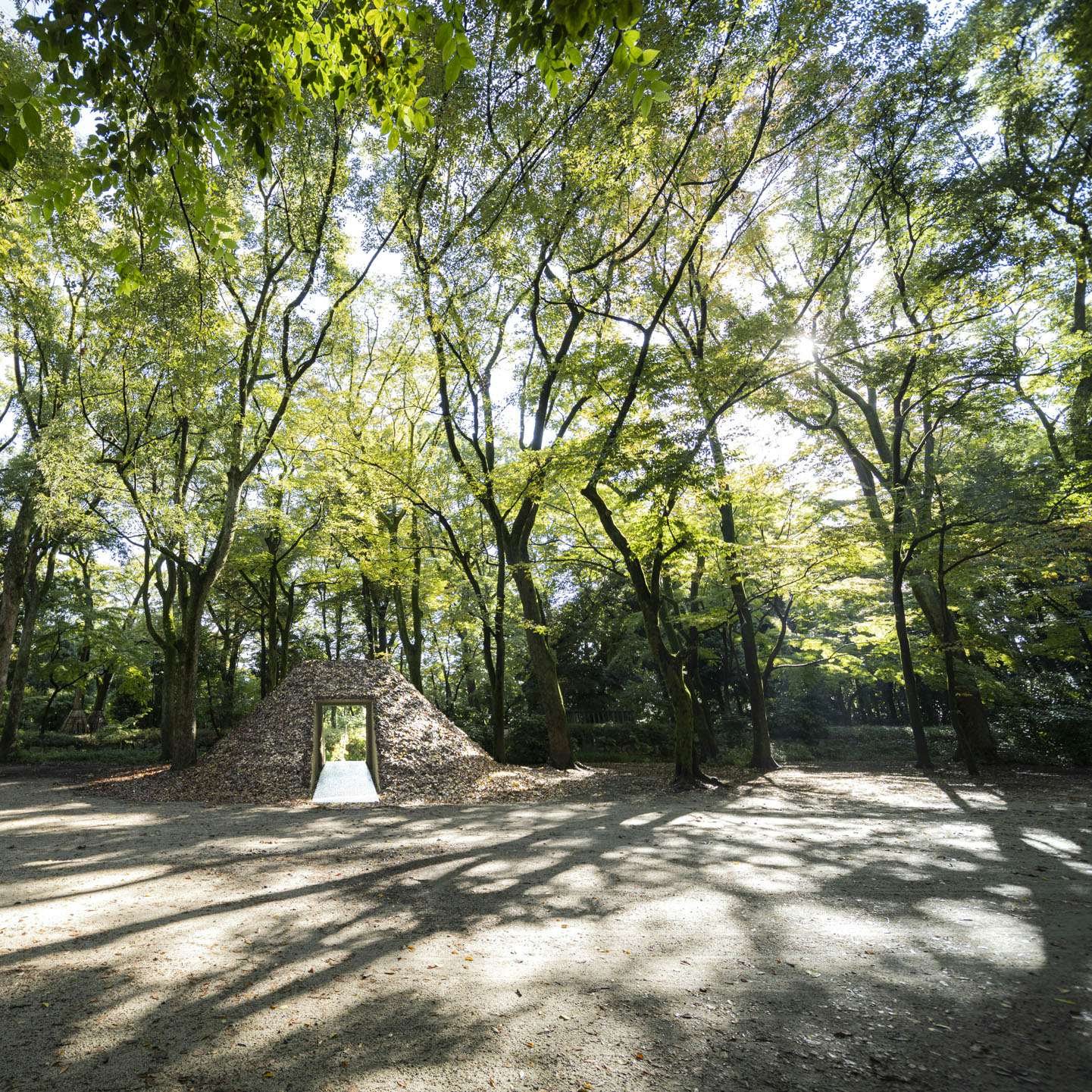 清々しい空気が流れる下鴨神社で、まず鑑賞者を包み込むのは糺の森。縄文時代から続くとされる3万坪以上の広大な森を歩いていくと、こんもりとした落ち葉の山が見える。じつはこれがひとつ目の展示会場だ。