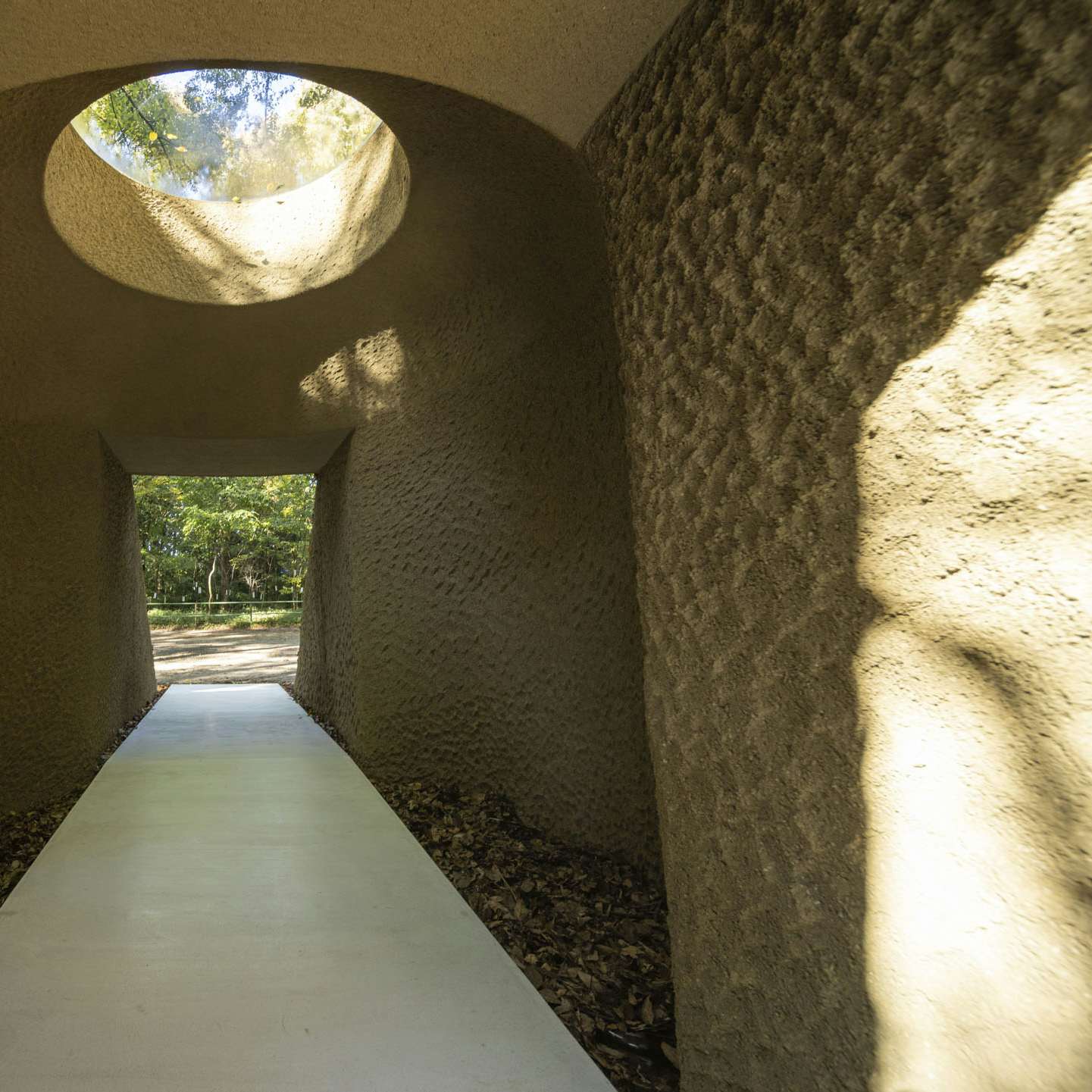 参道を思わせる白い通路を進むと現れる天窓。「枝の美しさや葉の移ろいを見せたい」という片桐の思いが反映されたものだ。これを抜けると境内から流れる清らかな小川があり、そこに生けられた花々が周囲の風景に溶け込んでいる。まさしくここは、心を清めてくれる御手洗のような空間なのだ。