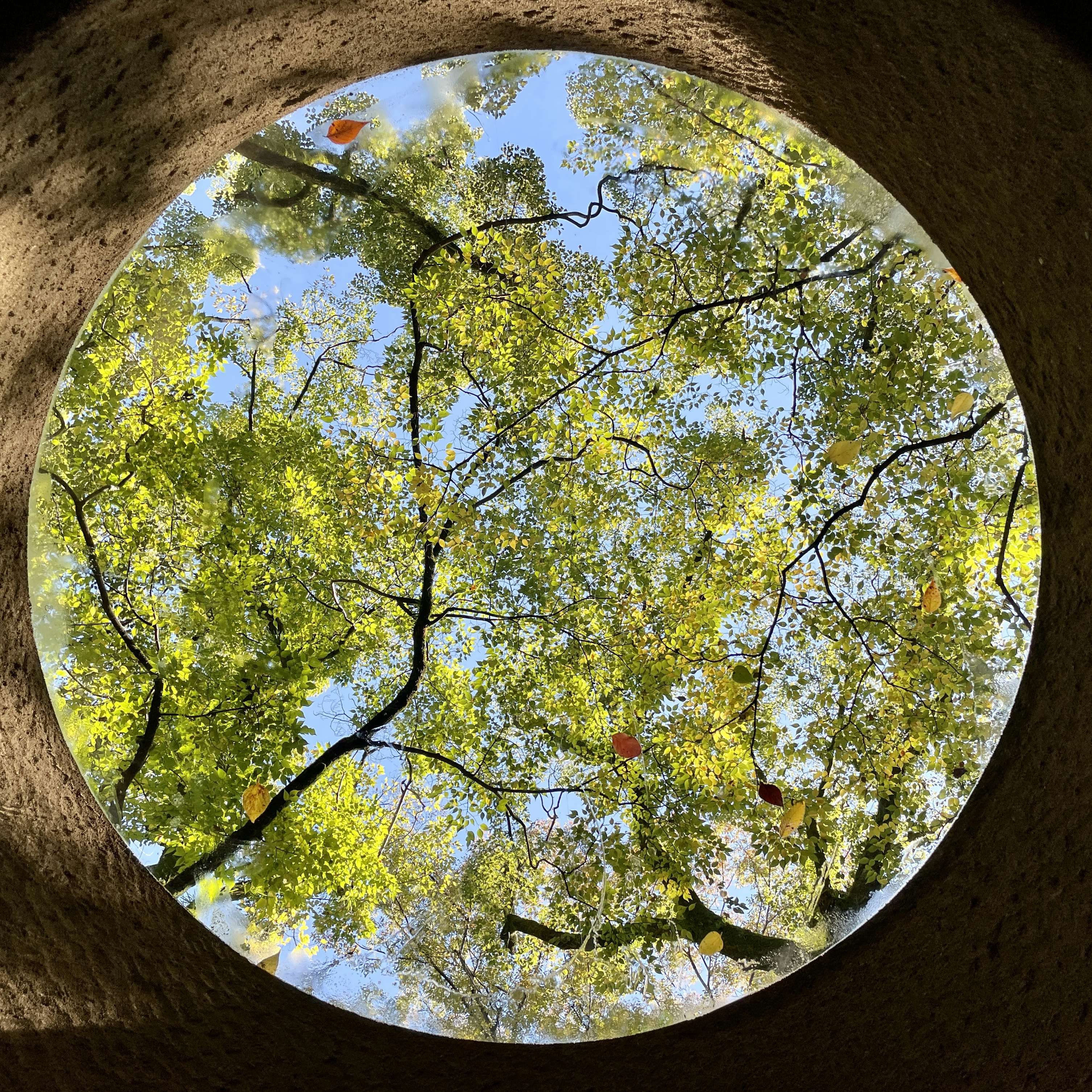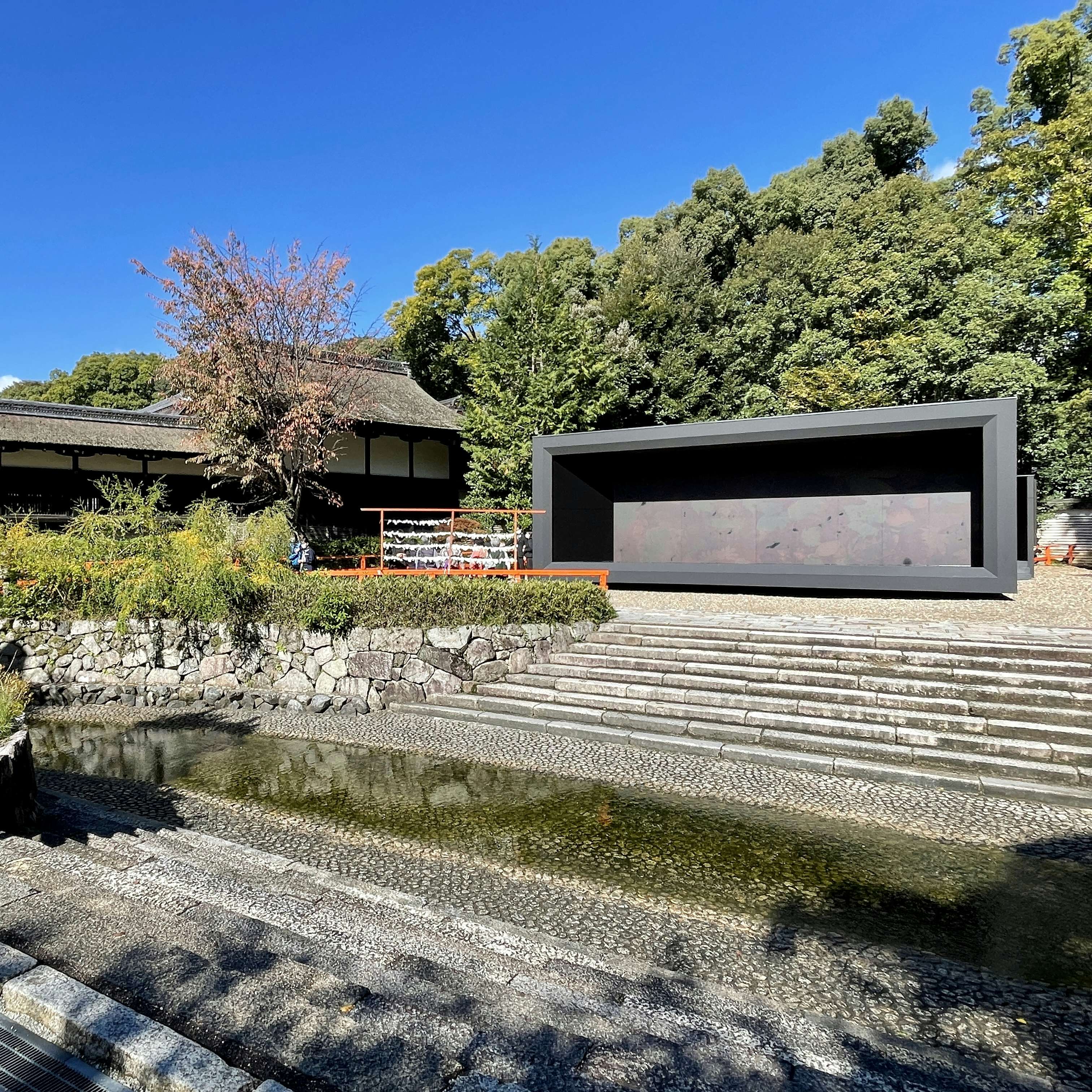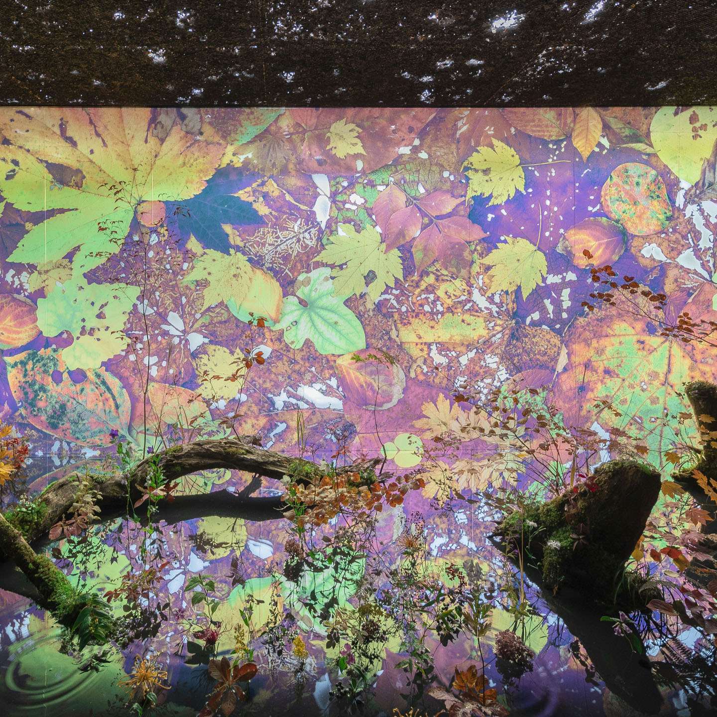 糺の森を抜けた先にある境内には、本展のために設計された巨大な特設会場が姿を見せる。紅葉した虫食いの葉っぱを写したファサードと、これを挟む内外の水盤。建物はブラックキューブとなっており、赤く色づいた葉が鮮やかな色を放つ。また天井には落ち葉が敷き詰められ、そこから漏れる陽の光は星のようだ。