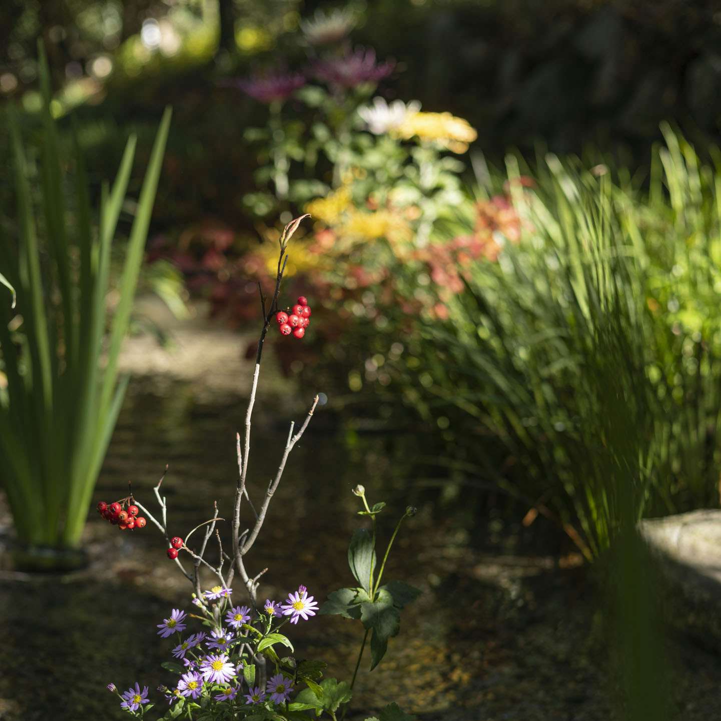 秋は、花の季節から花がない季節に移り変わっていく時期であり、一見生け花には不向きなようにも思える。しかし片桐は、「終わっていく季節があるから、またその次の春に芽吹く季節があるっていう循環が自然の美を永遠ものにする」「落ち葉の下には、芽吹くために力を蓄えている植物がある。その世界を感じてもらいたい」と話す。自然界で延々と繰り返される循環。それを実感できる、静謐な空間だ。