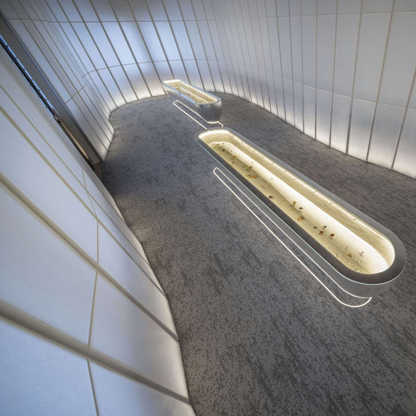 展示空間は、建築と呼応するようにアールを活かしたデザインとなっており、和紙の壁紙が柔らかに光を反射する。特注の展示ケースは木製で、銀箔を施すことで未来の船のような印象も与えている。