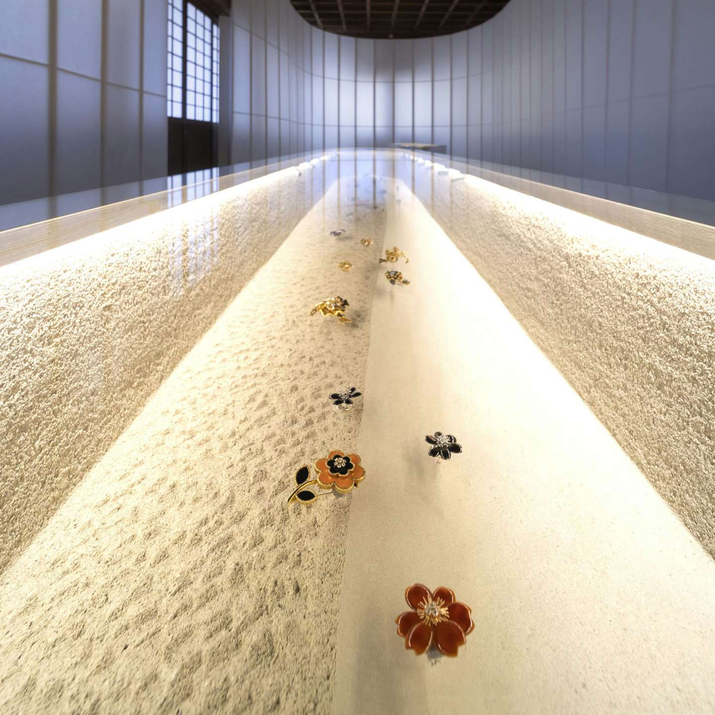 さらにケース内部は左官職人・久住有生の仕事によって水面のような揺らめきが表現された。御手洗から始まる展示の終着点となるこの水面に咲くのは、72点ものハイジュエリー。すべてが「花」や動植物をテーマにキュレーションされたもので、メゾンの歴史を伝えるように、様々な年代の作品が混ざりあいながらも連続性を持って展示されている。