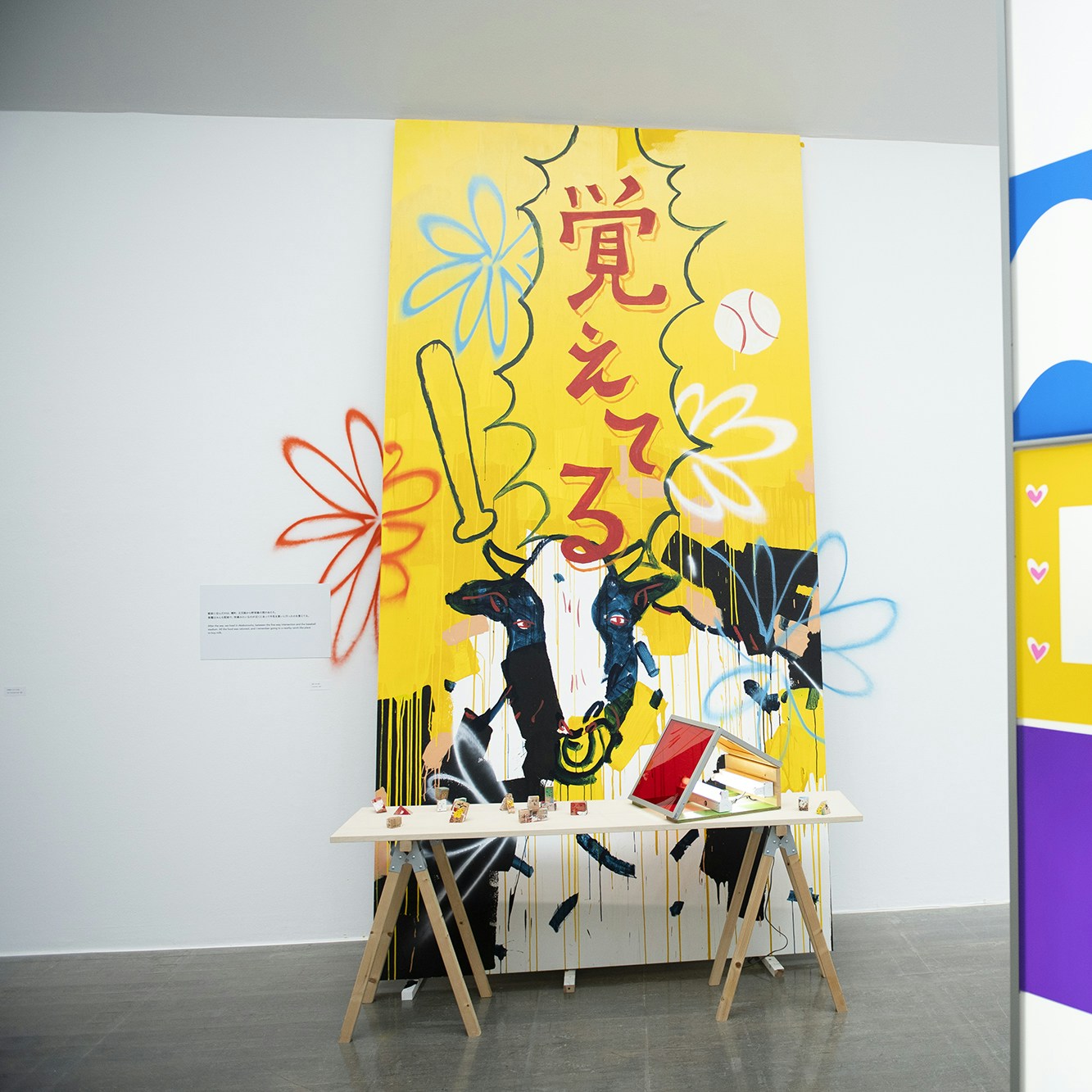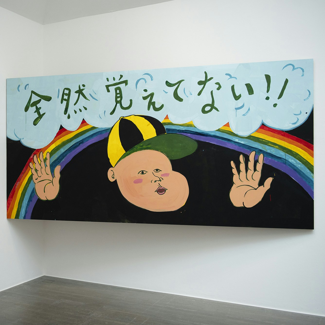 会場に入ると、最初に新作ペインティング《全然覚えてない!!》が目に入ってくる。壁には、作品の着想源となったインタビューから引用したテキストが貼られている。