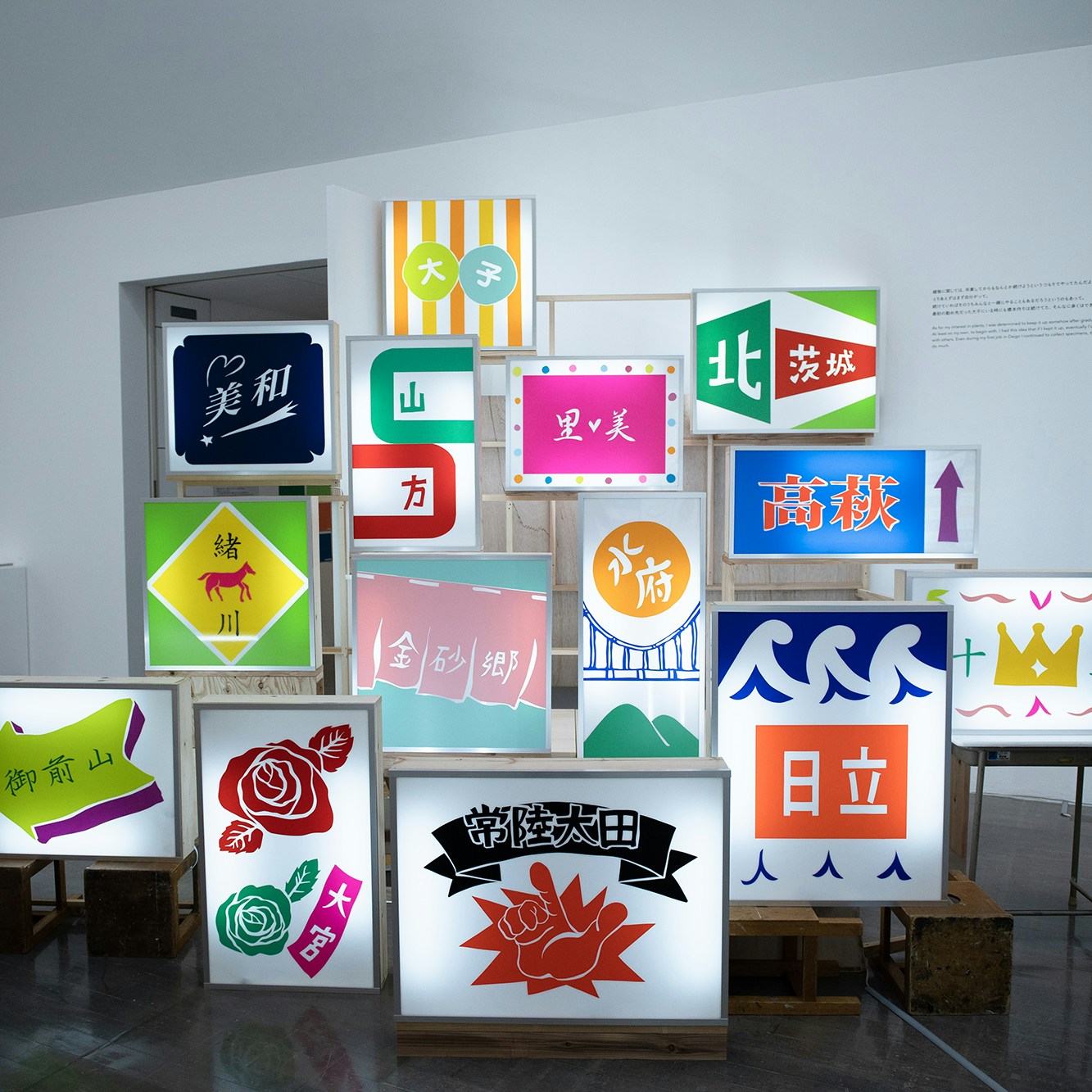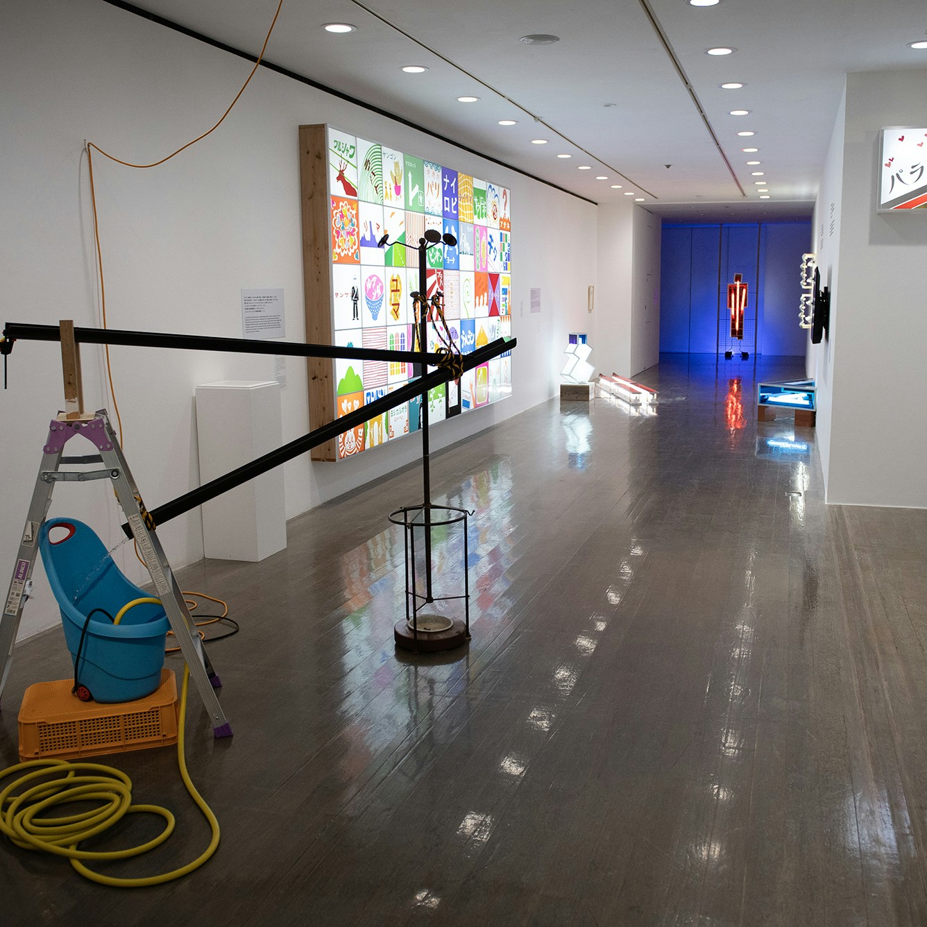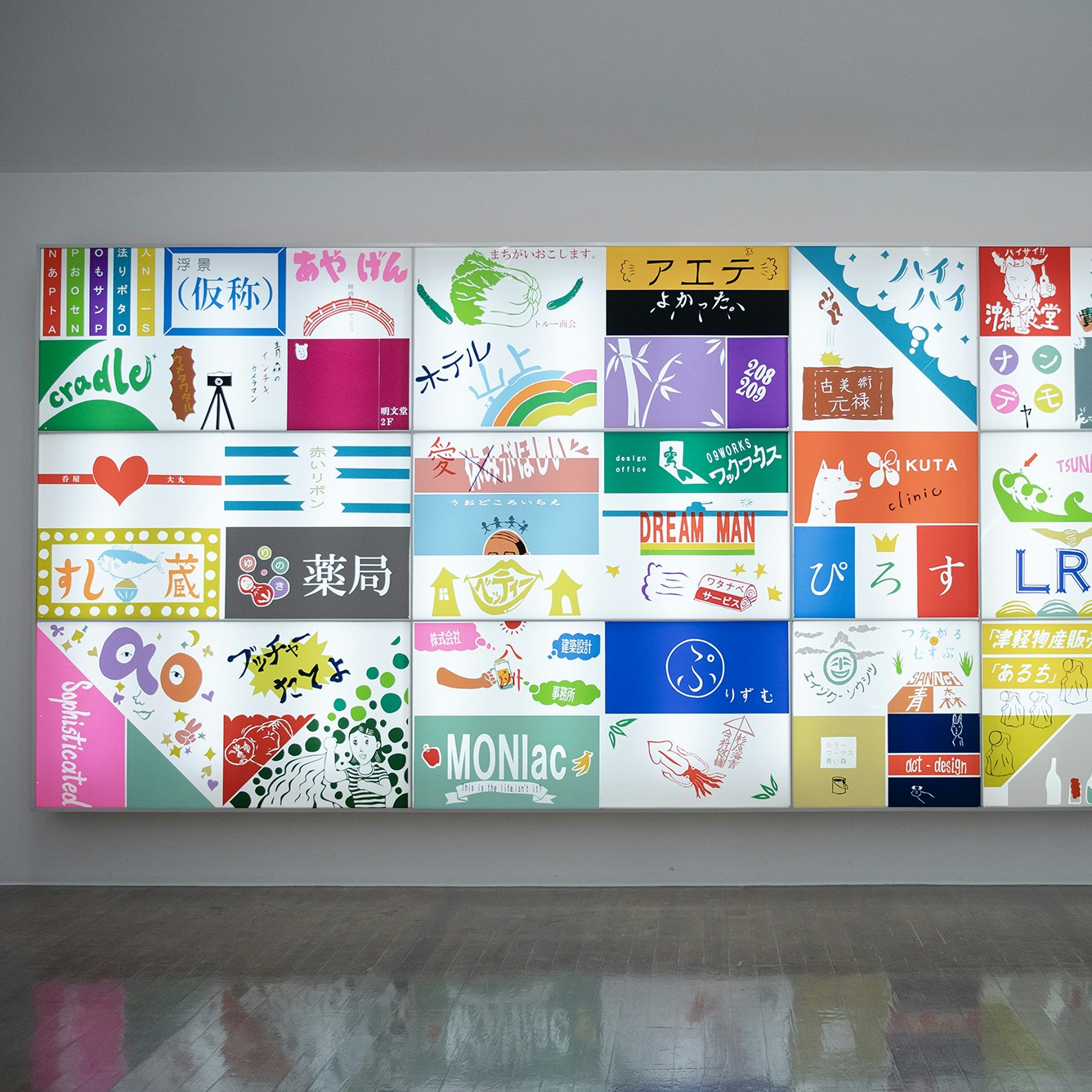 突き当たりの展示室には、中﨑の代表的な作品フォーマットである単色のカラーアクリルと蛍光灯を組み合わせた、ライトボックスと看板の作品が集まっている。きっかけは、2001年1月の卒業制作の発表だった。「現代美術は何をやってもいい」と言われたものの「何をもって美術と言えるのか」とドツボにハマり、悩んだ果てに「デザインじゃないものであれば美術になるのでは」というアイデアが浮かんだ。デザインの契約ではあり得ない条件の契約書をもとにアベコベな看板をつくれば、アート作品たるのではないかという発想から生まれたのが「看板屋なかざき」シリーズだ。展示室奥の壁に設置されたのは、シリーズより2006年に青森市の新町商店街で制作した集合看板の作品だ。商店街の店を中心に多くの依頼を受けて制作。一定期間、街に展示され、看板広告として機能した。