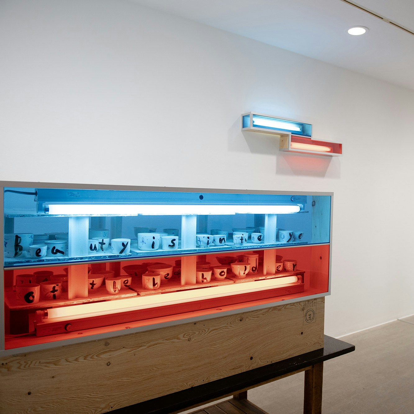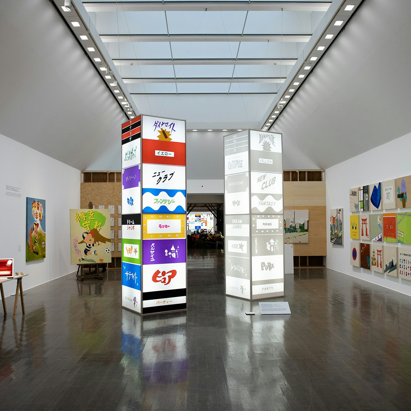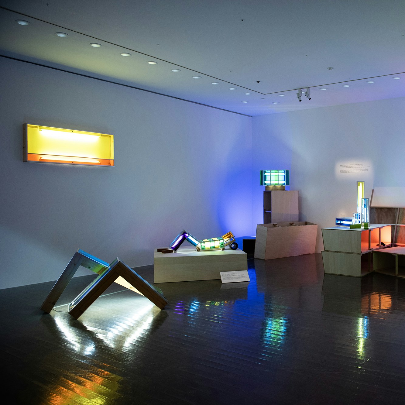 突き当たりの展示室には、中﨑の代表的な作品フォーマットである単色のカラーアクリルと蛍光灯を組み合わせた、ライトボックスと看板の作品が集まっている。きっかけは、2001年1月の卒業制作の発表だった。「現代美術は何をやってもいい」と言われたものの「何をもって美術と言えるのか」とドツボにハマり、悩んだ果てに「デザインじゃないものであれば美術になるのでは」というアイデアが浮かんだ。デザインの契約ではあり得ない条件の契約書をもとにアベコベな看板をつくれば、アート作品たるのではないかという発想から生まれたのが「看板屋なかざき」シリーズだ。展示室奥の壁に設置されたのは、シリーズより2006年に青森市の新町商店街で制作した集合看板の作品だ。商店街の店を中心に多くの依頼を受けて制作。一定期間、街に展示され、看板広告として機能した。