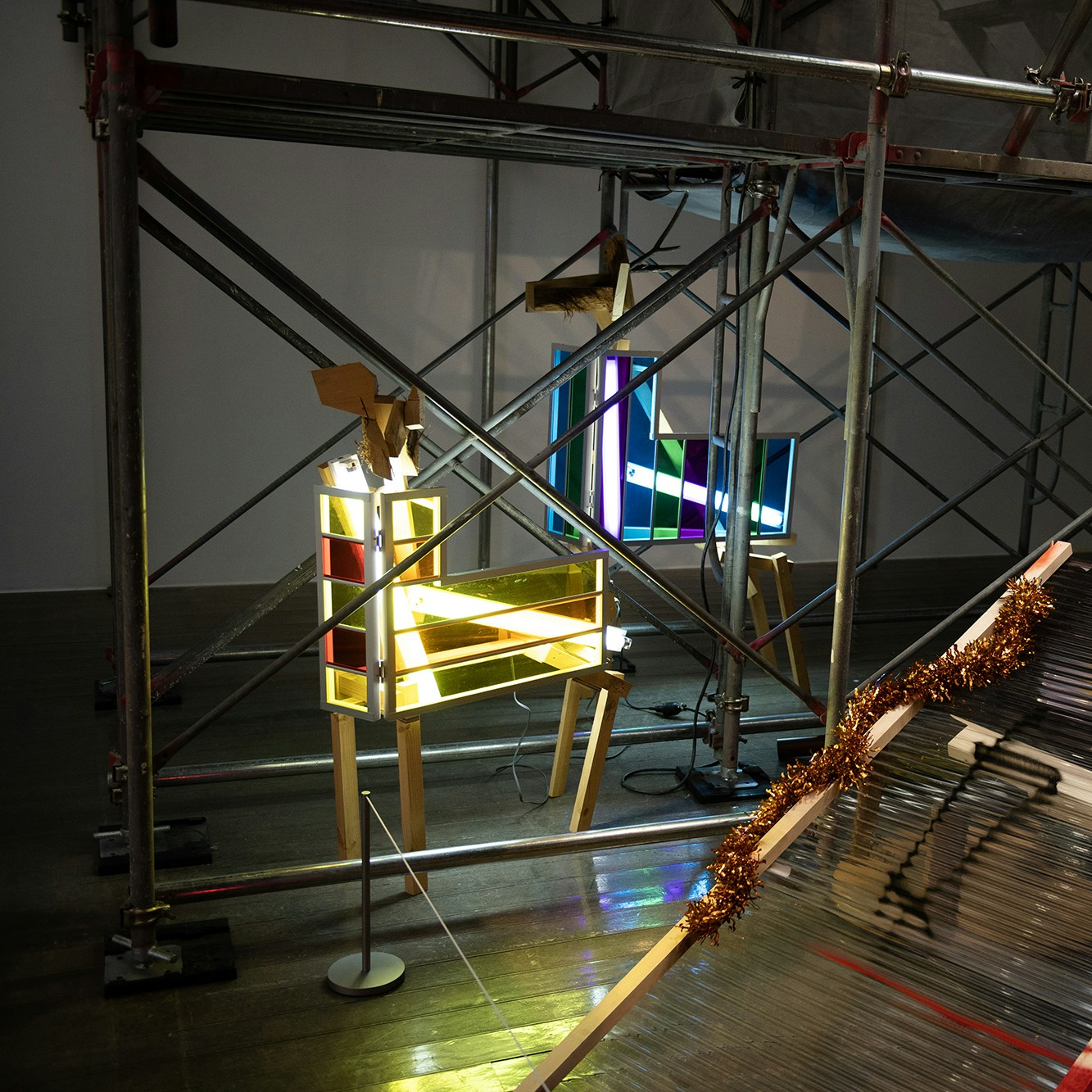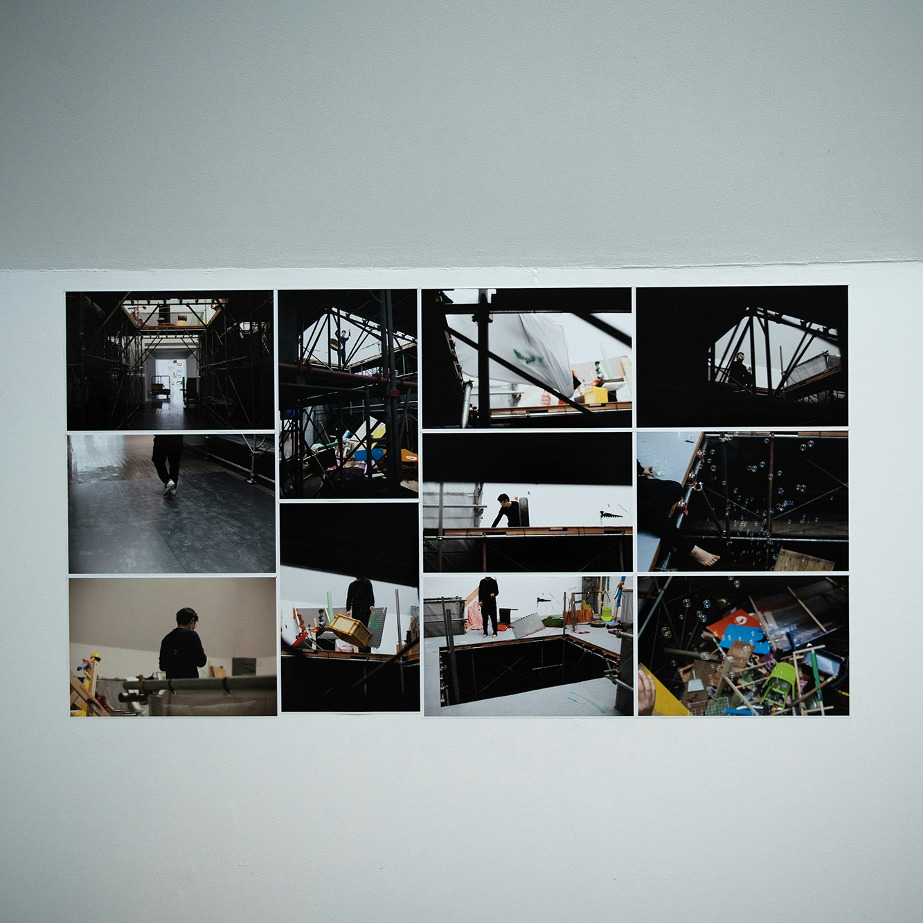 続く展示室には、小屋を解体した瓦礫が積み上げられ、足場が組まれてワンフロア分の展示空間が上に仮設されている。大阪市此花区でキュレーターの後々田寿徳(故人)がかつて運営していたオルタナティブ・コマーシャル・ギャラリー梅香堂で2011年に開催した個展「エピソード:鼻歌まじりの引越の時間はいつかは終わる。だから僕はなるべく回り道をする。」を再制作した。1階と2階に展示スペースがあり、2階の床に穴が空いている空間の特性を活かし、ものが移動する時間軸のあるパフォーマンスを発想した。