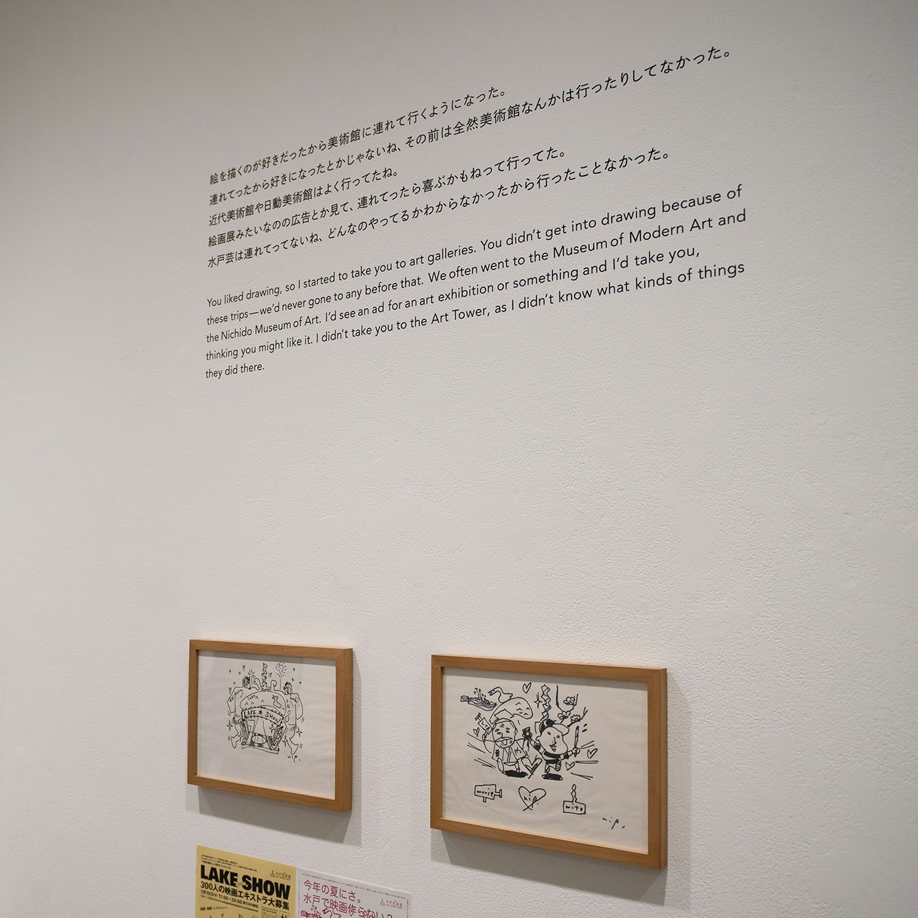 展示は突き当たりから折り返すかたちで、通路上の空間に展開する。「絵を描くのが好きだったから美術館に連れて行くようになった」「水戸芸は連れてってないね。どんなのやってるかわからなかったら行ったことなかった」という文字は、中﨑の両親いずれかの言葉だろう。多くのドローイング作品が並ぶ。