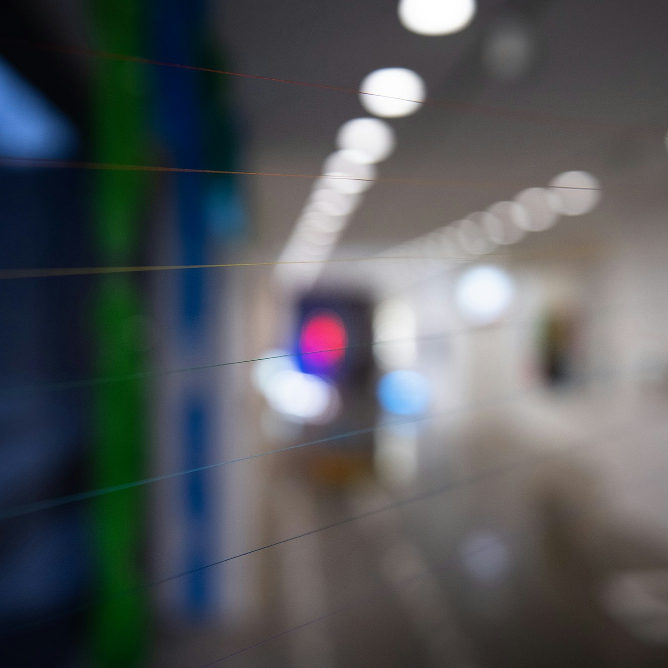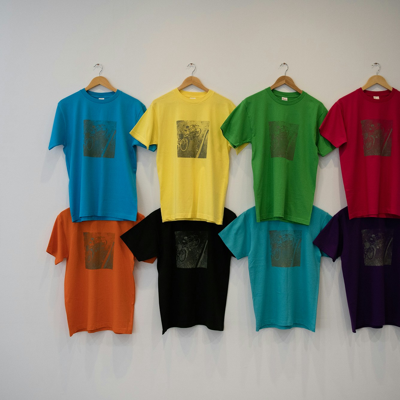2011年の震災で茨城県も被害を受けた。異なる状況や考えの違いのもと、わかり合うことの不可能さを感じつつも、そこに「交わらない平行線としての虹の在り方が、見方によっては互いに違う存在がどこまでも隣で寄り添うような風景にふと見えた」ことから、7色の糸を用いた繊細なインスタレーションも完成させた。そんなときにチャリティ作品の依頼を受け、自分も被災者側だと疑問を感じつつも手がけたのが、自転車をプリントしたTシャツ(チャリT)だ。