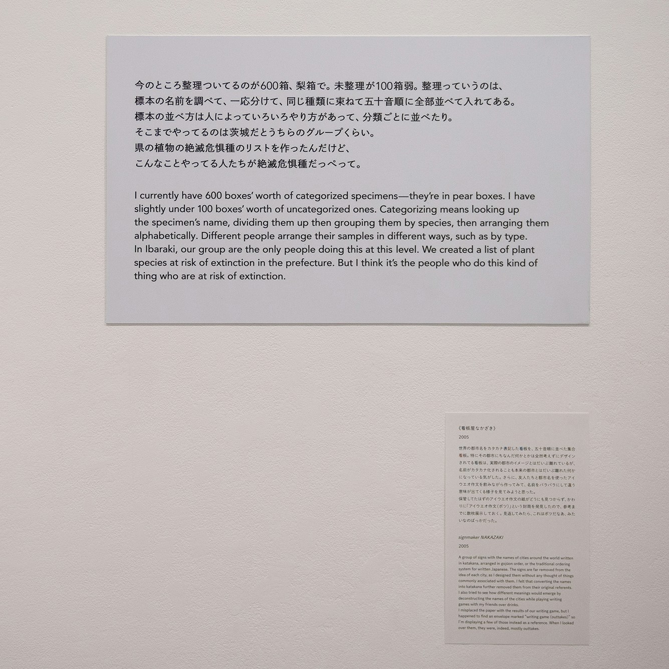 「父親は新聞紙に植物を挟んで押し花のように保存して分類する植物採集をしていて、ものすごい数の標本が家に保管されています。ものによっては、博物館に納めもしています。それについても色々聞けたので、美術館と自分の作品の関わりともリンクできて面白いと感じ、父の研究に関するコメントもちりばめました」。