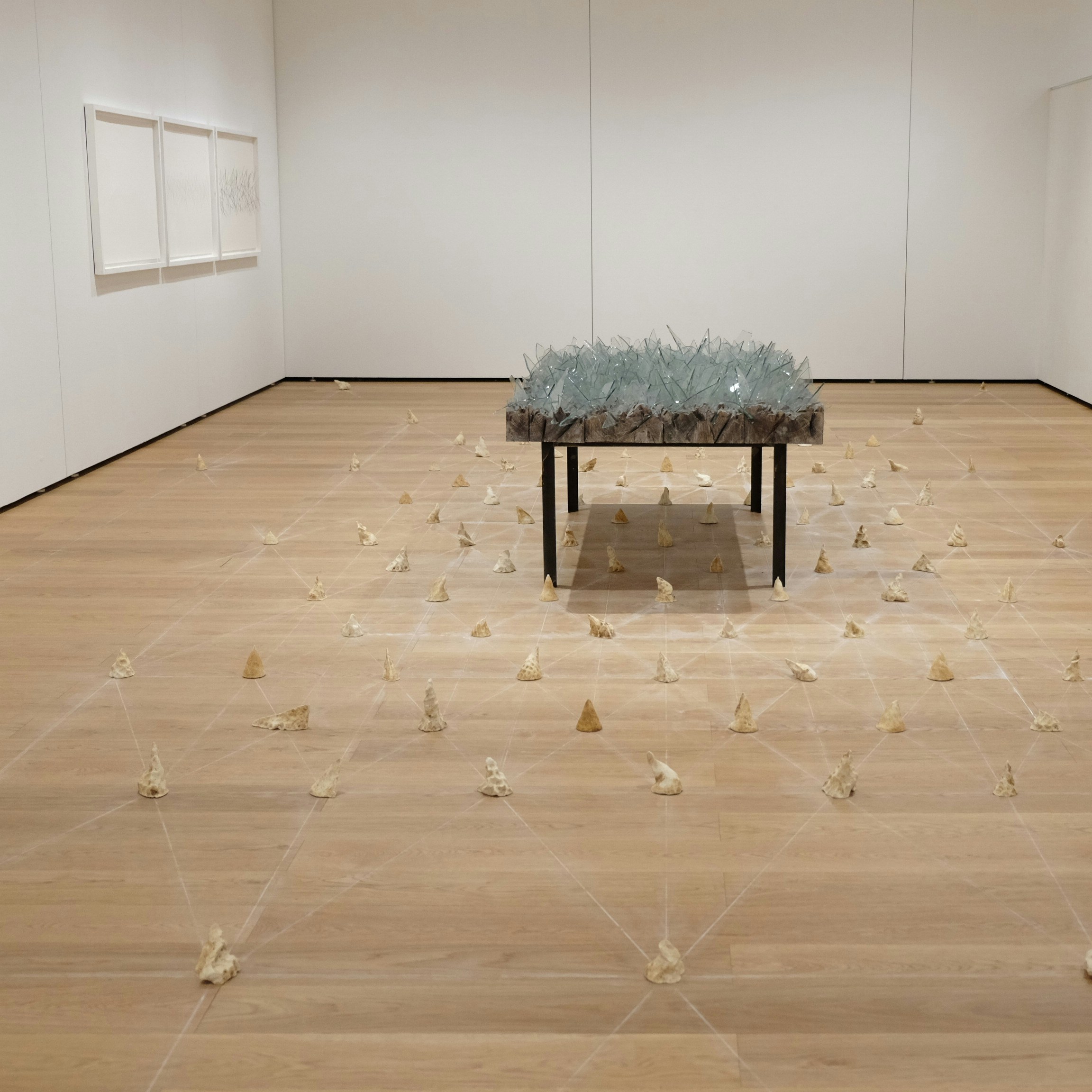 《連句的Ⅱ》(1996)は床一面を使った圧巻のインスタレーションだ。本作は96年にケンジタキギャラリーで発表された作品を再制作したもので、当時の展示スペースの縦横比も再現されている。阪神大震災より構想した作品で、中央の痛々しく割れたガラスの周囲にはチョークによる線や粘土の塊が規則性をもって配置されている。寒々しい山脈を思わせるチョークの粉の体積や頭蓋骨のような造形物など、全体的に死の匂いが漂うが、いっぽうで、床に引かれた線の曼荼羅からは、松澤宥をはじめとする日本概念派との類似も感じられる。ここに、悲劇を超越的な想像力で乗り越えようとする希望も感じられはしないだろうか。