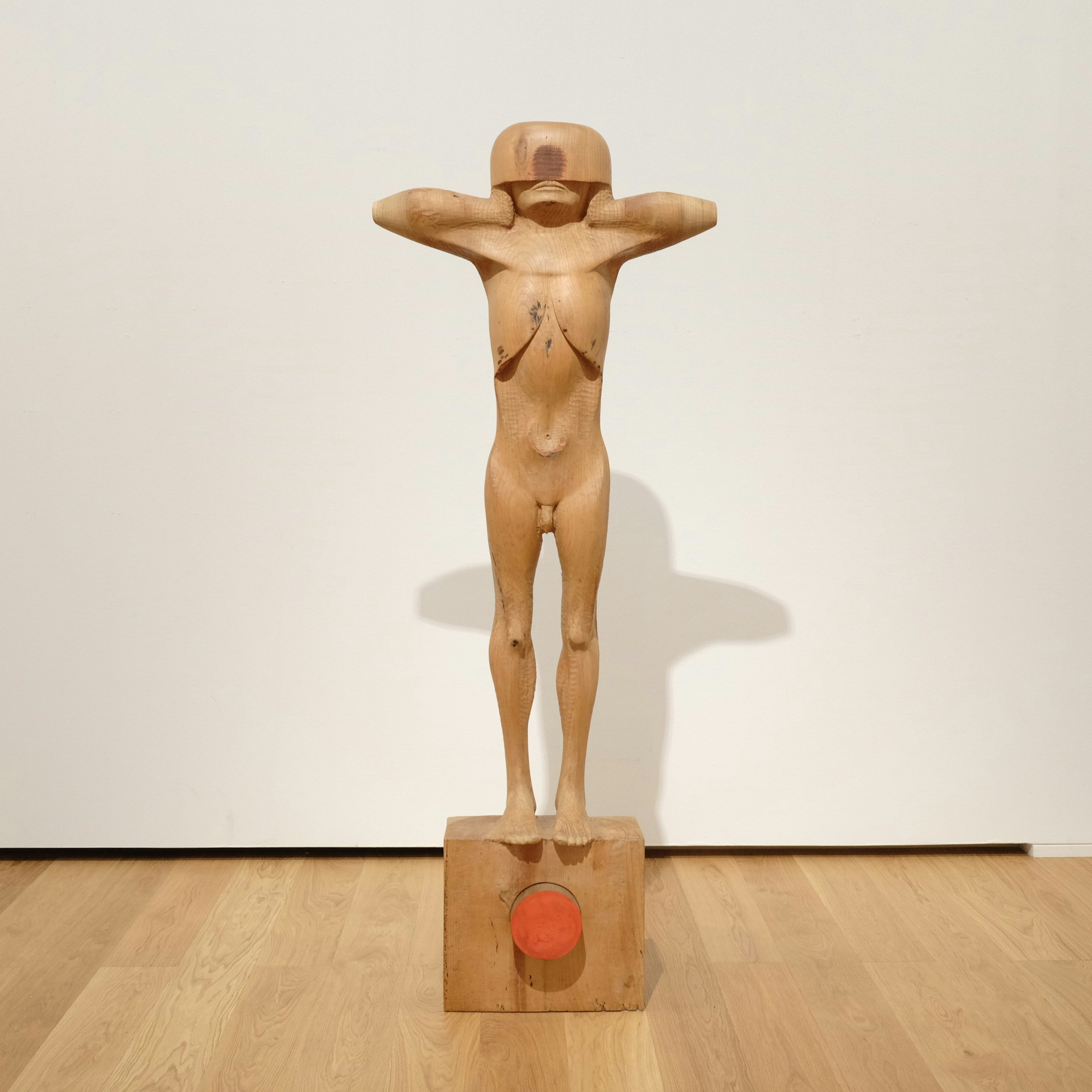その思想の原点は、2階の第2展示室に展示された初期作品からうかがえる。《器Ⅲ》(1973)は戸谷の愛知県立芸術大学の卒業制作だ。少年が目を閉じ、耳をふさぎ、口をつぐんで立っており、赤い丸は日の丸も連想させる。本作はベトナム戦争のさなか、戸谷自身が何も行動できていないことを痛感して制作された自刻像だという。あばら骨が浮いたような胸部や腹部の表現からは、近代彫刻を参照しながら確固たる彫刻技術を身につけ、彫刻を模索した当時の戸谷の姿勢もうかがえるだろう。