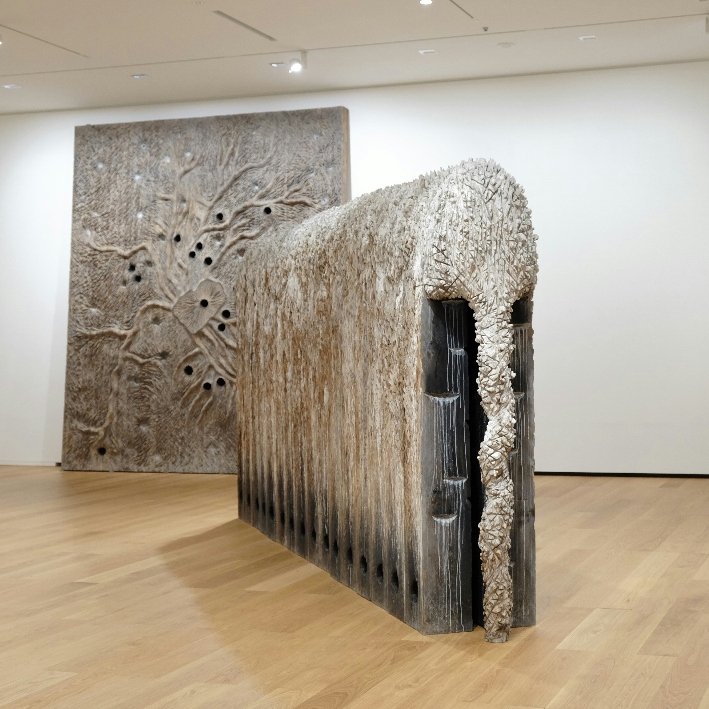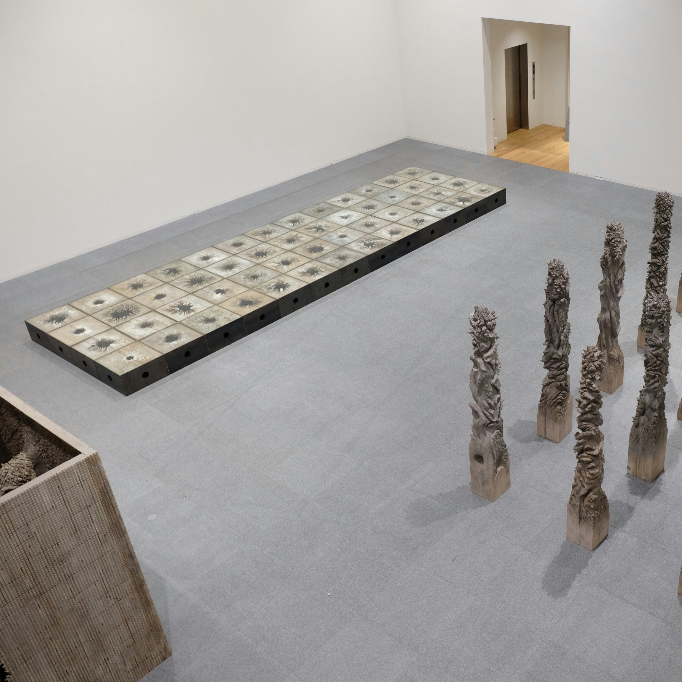 本展は年代順に作品を並べて戸谷のキャリアを追うものではなく、作品のコンセプトや制作にあたっての思索の類似性によって展示構成がなされている。エントランスから第1展示室に足を踏み入れると、2メートルほどの木柱彫刻が林立する《森Ⅸ》(2008)や、《洞穴体Ⅴ》(2011)、《地霊Ⅲ-a》(1991)といった大型の作品が並ぶ。