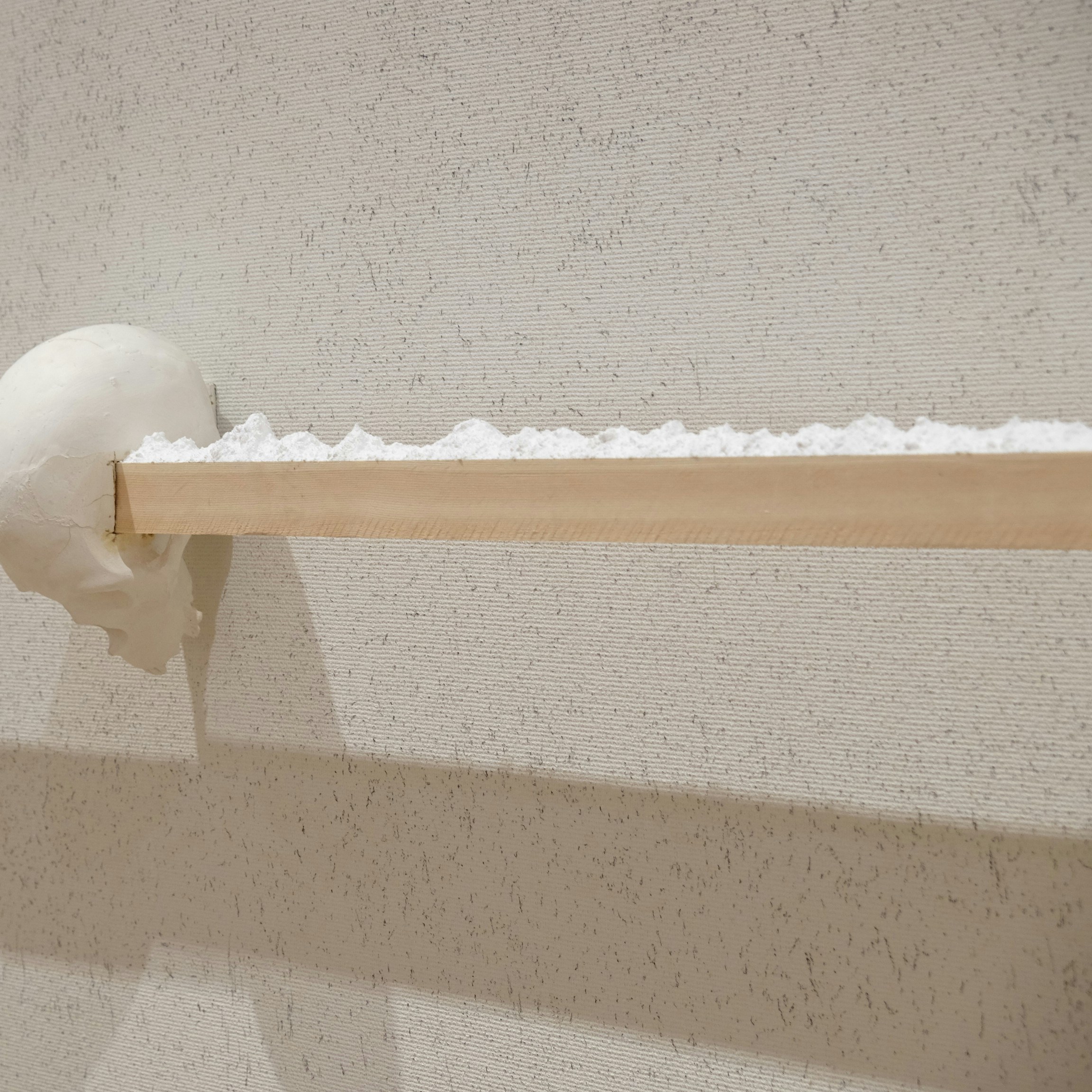 展示室の壁面に張りついた《森化Ⅱ》(2003)では、角柱をふたつに割ることで壁に顔を貼り付けた人物と思わしき姿が対となって現れている。その輪郭はキュビスムの絵画のような多面性をもっており、人間とその影、自己の存在の在り処といった思索を誘発させる。
