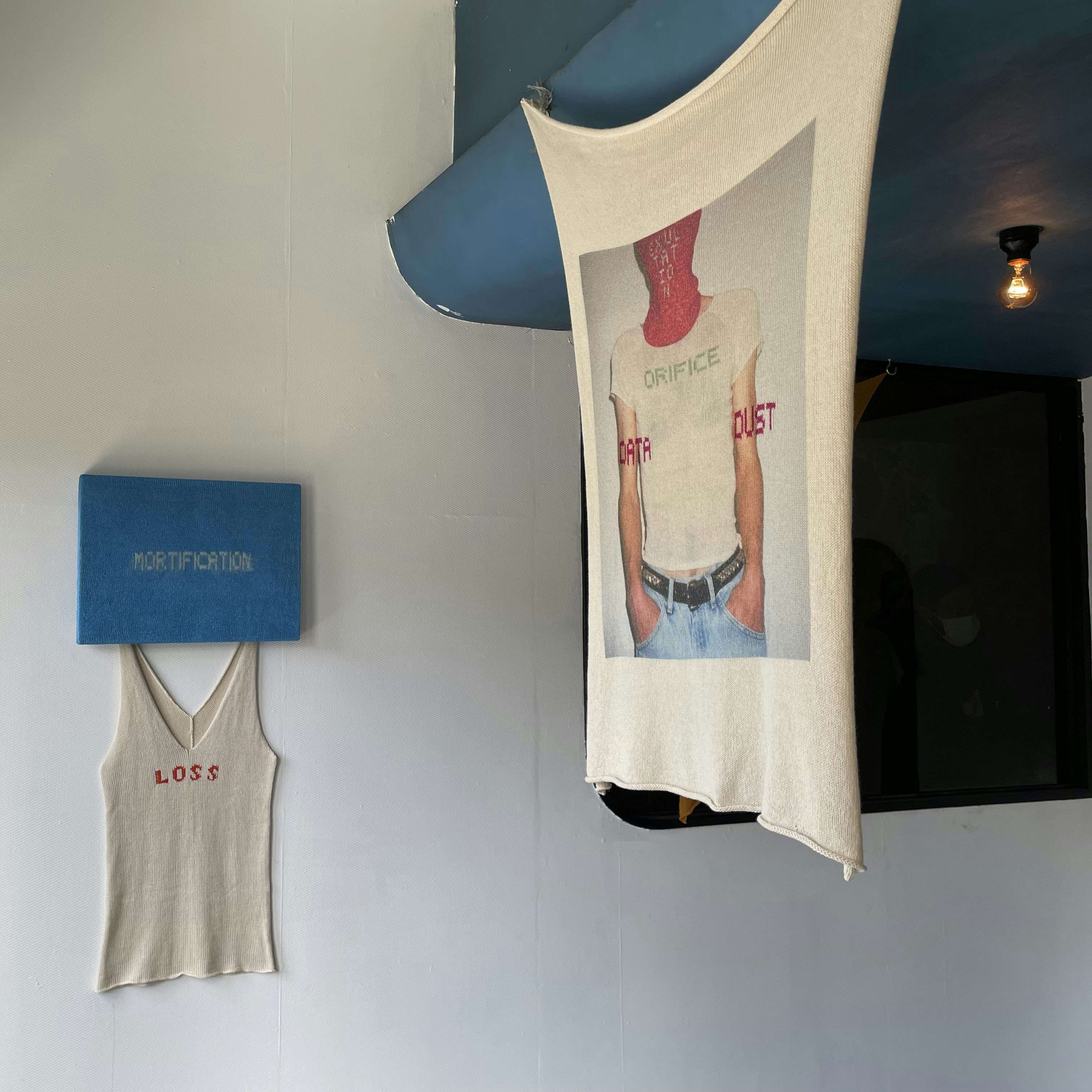 喫茶店の跡地には、アメリカ・カリフォルニア出身のアーティストで元ライターのパトリック・キャロルの手編み作品が並ぶ。2019〜20年に父の終末医療による死とパンデミックという2つの悲劇を体験したキャロルは、同時期に入手していた家庭用手編み機で言葉や文章を綴った作品を紡ぐことに没頭した。会場では、父親を失った悲しみや自身のジェンダーに関する言葉が、キャンバスや衣服にかたちを変えて展示されている。