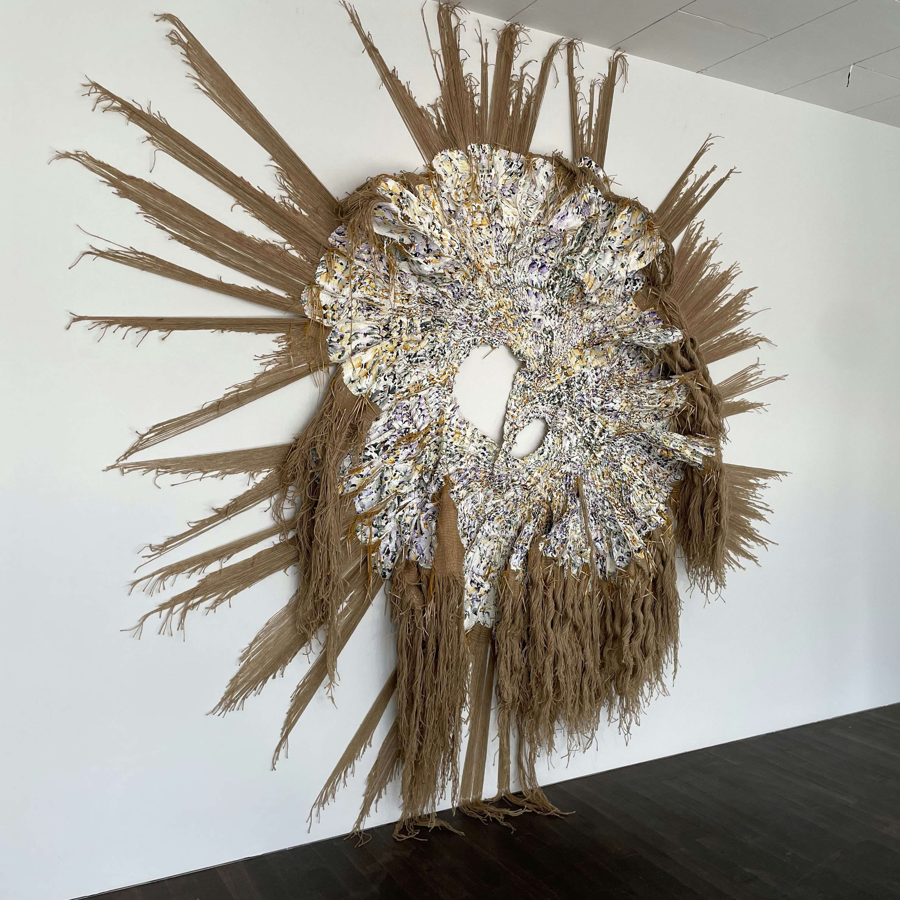 村山の作品は旧文化服装学院にも展示されている。ツリー状に編まれた紐をキャンバスとしてドローイングされた《自己組織化する絵画<過剰に>》は、立体上で村山の手法が展開された実験的な作品と言える。また、同会場にはフランス人アーティスト、エレン・ロットの《とまらないもの・ONGOING》も展示。「街の発展と衰退の記憶」から商店街のファザードに着目した、コラージュのようなテキスタイル作品が目を引いた。本作は織りの目も美しいため、ぜひ間近でも鑑賞してみてほしい。