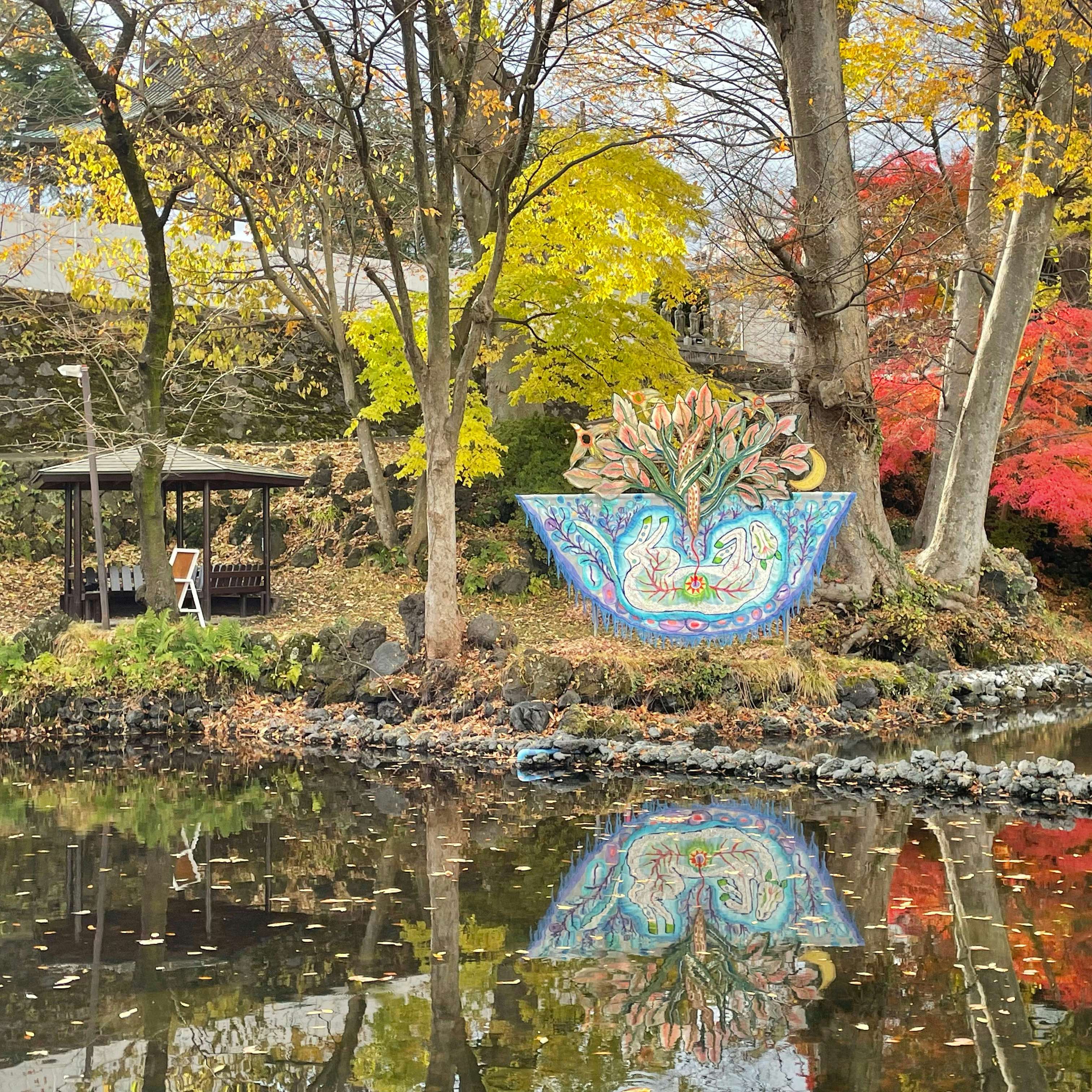 月江寺の池に映し出されるのは、テキスタイルの技法を用いて生命の本質的な姿を描き出す小林万里子による作品。小林は富士吉田と馬の関係に着目し、登山用語で「馬返し」と呼ばれるキーワードから《足を汚し、世界を開く》を制作した。そこに込められた「人は自身の足を汚してでしか行けない場所がある」というメッセージの通り、作品に刺繍された馬の胎児が水面に映ることで自分の足で立つ様子が、この展示空間ならではの表現として成立していた。
