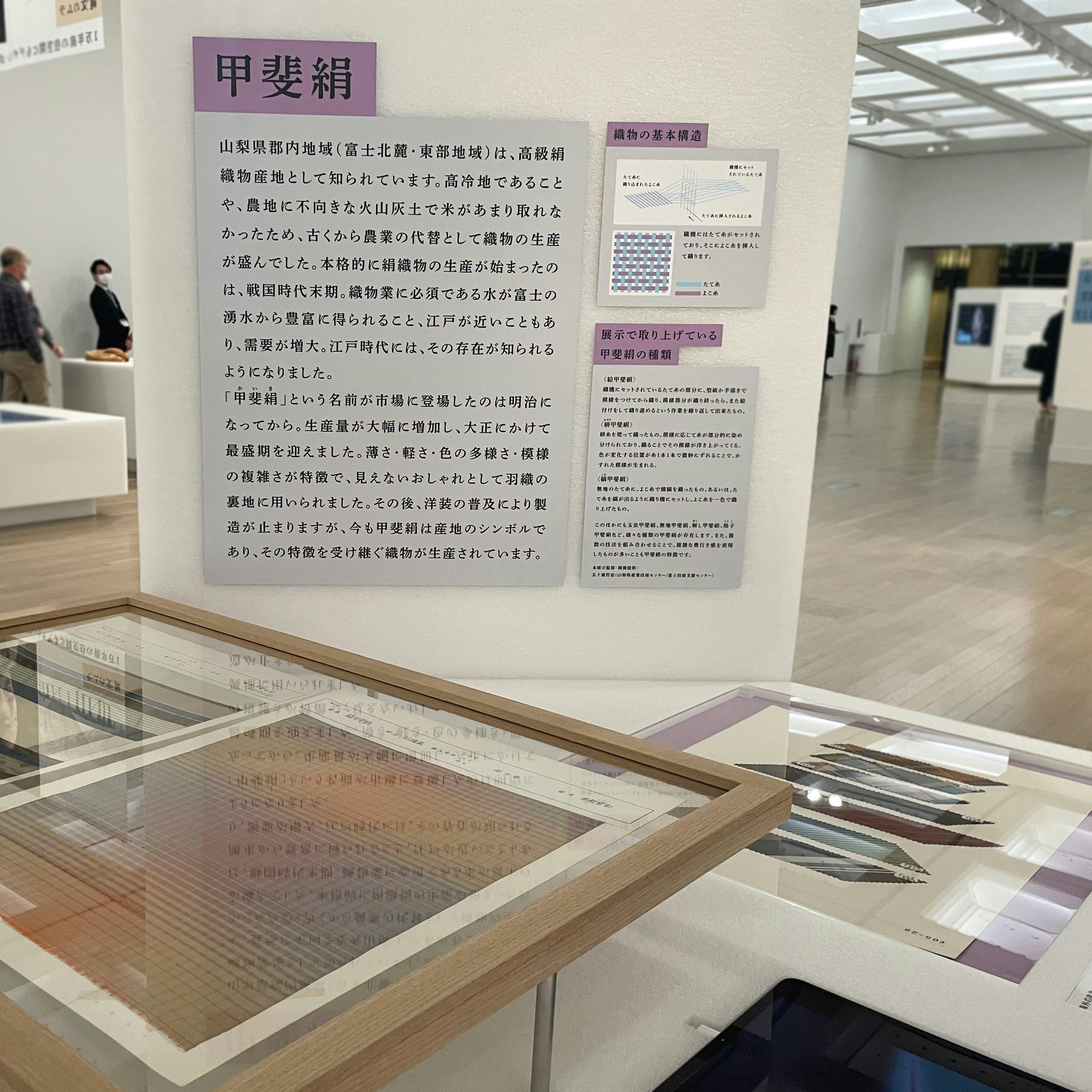プロダクトデザイナー・柴田文江は、自身の出身地であり、織物産業でも有名な山梨県郡内地域(吉田市、西桂町、都留市、大月市、上野原市)をリサーチ。江戸から明治期にかけてつくられていた「甲斐絹(かいき)」の、独特な色彩や薄さ、軽さ、そしてCGのようなレイヤー構造を目の当たりにした。現在はコストの関係で製造されていないこの甲斐絹が、未来の技術でどう息を吹き返すことができるのか。柴田はそんな課題を投げかけた。