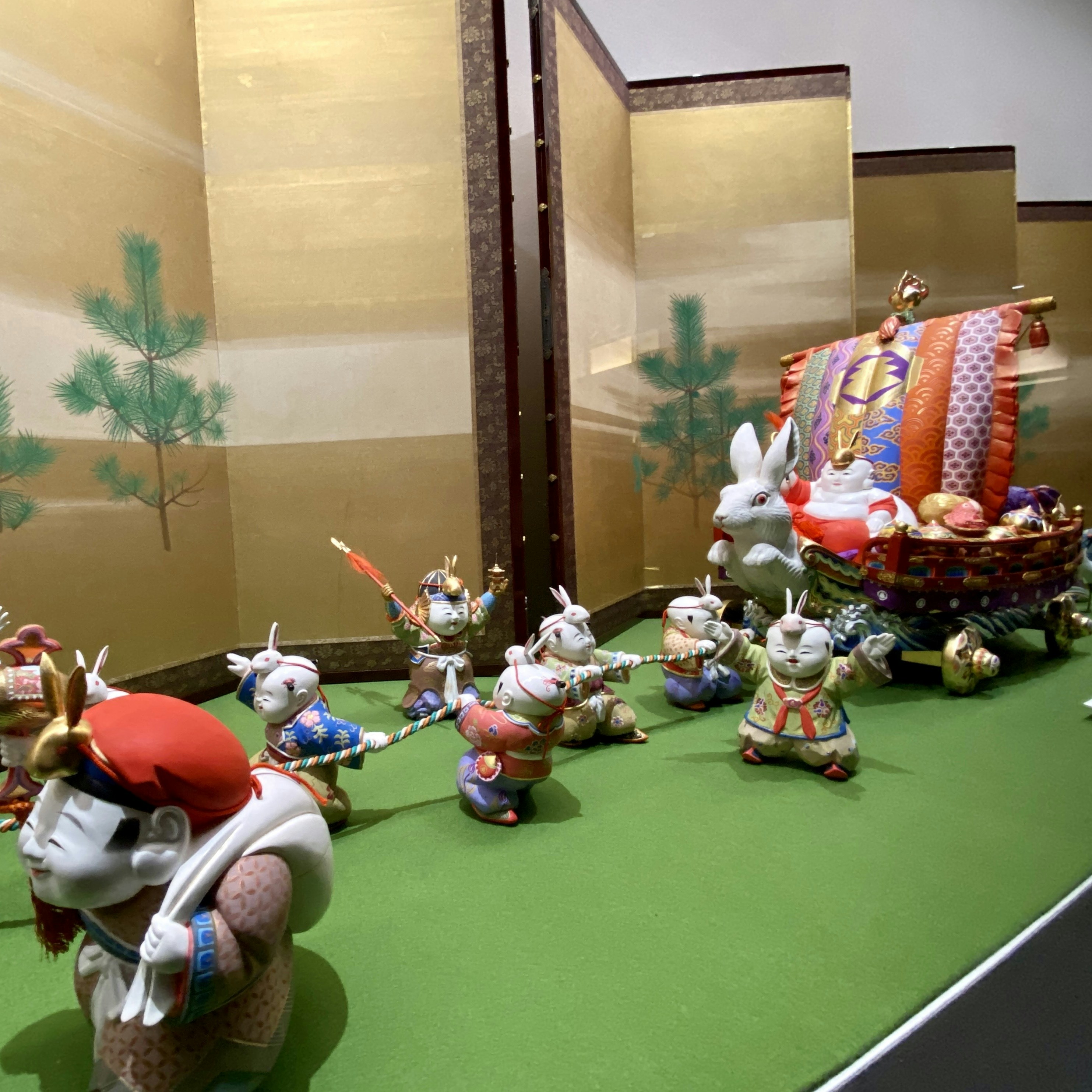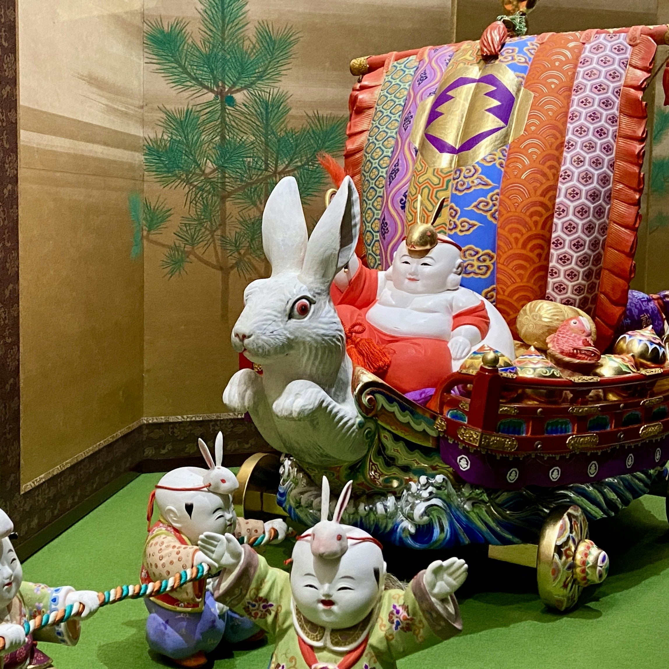 続くギャラリー2では、本展の目玉・五世大木平藏《木彫彩色御所人形》がお待ちかね。卯年生まれの岩﨑小彌太の還暦を祝して制作されたこの作品には、繁栄と飛躍の象徴である波兎(なみうさぎ)や七福神など、めでたいモチーフがふんだんに取り込まれている。