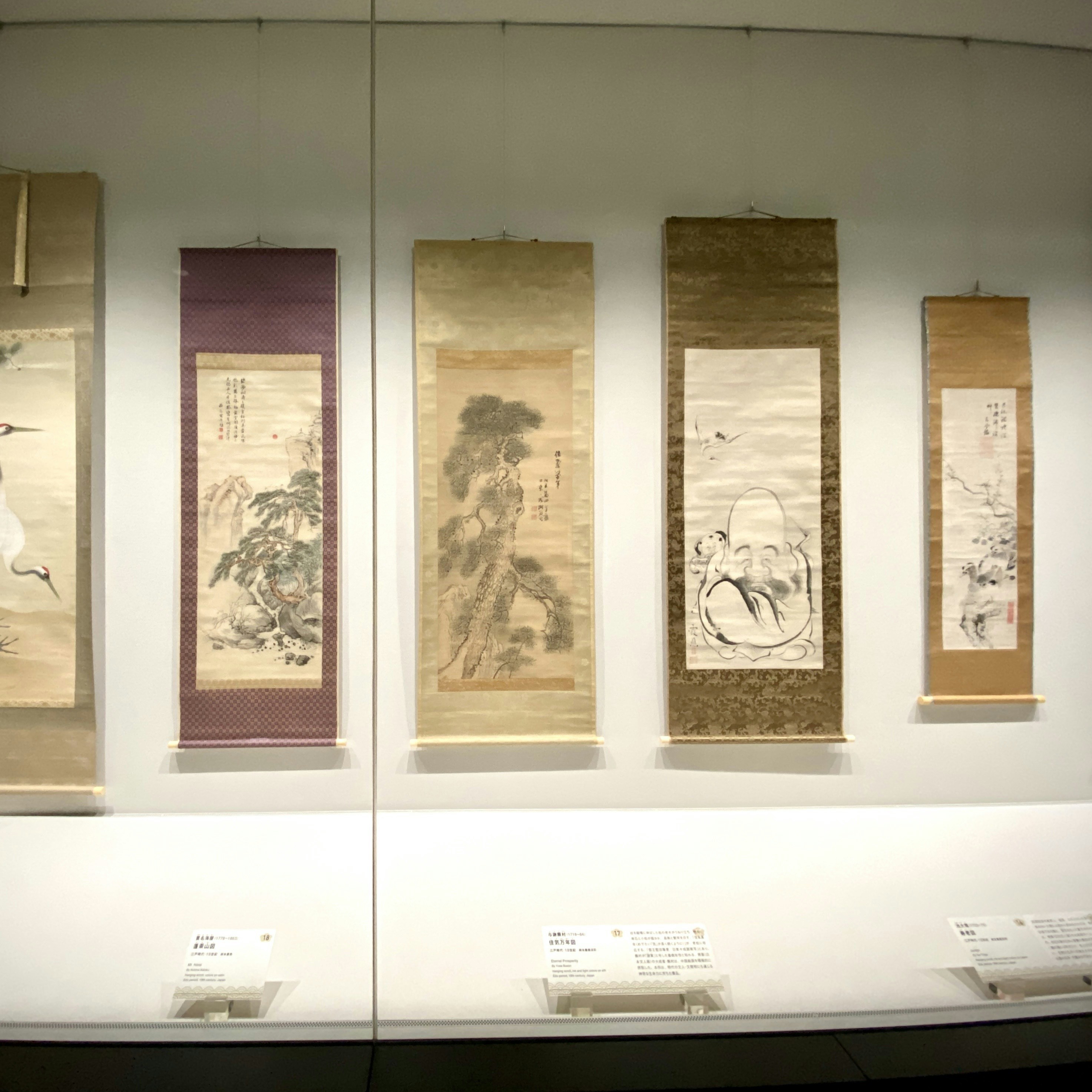 ここではまた、重要文化財の王建章《川至日升図》や、2羽の鶴や霊芝をダイナミックな筆跡で描いた池大雅《寿老図》、源氏物語の第23帖「初音」を描いた吉川霊華《子の日》など、様々な縁起の良いモチーフを描いた名品も並ぶ。作品の形態も、飛翔する双龍や蝶や花唐草を金泥で描いた永楽和全《金襴手雲龍文銚子》などの道具類や香合、焼き物など多岐にわたる。
