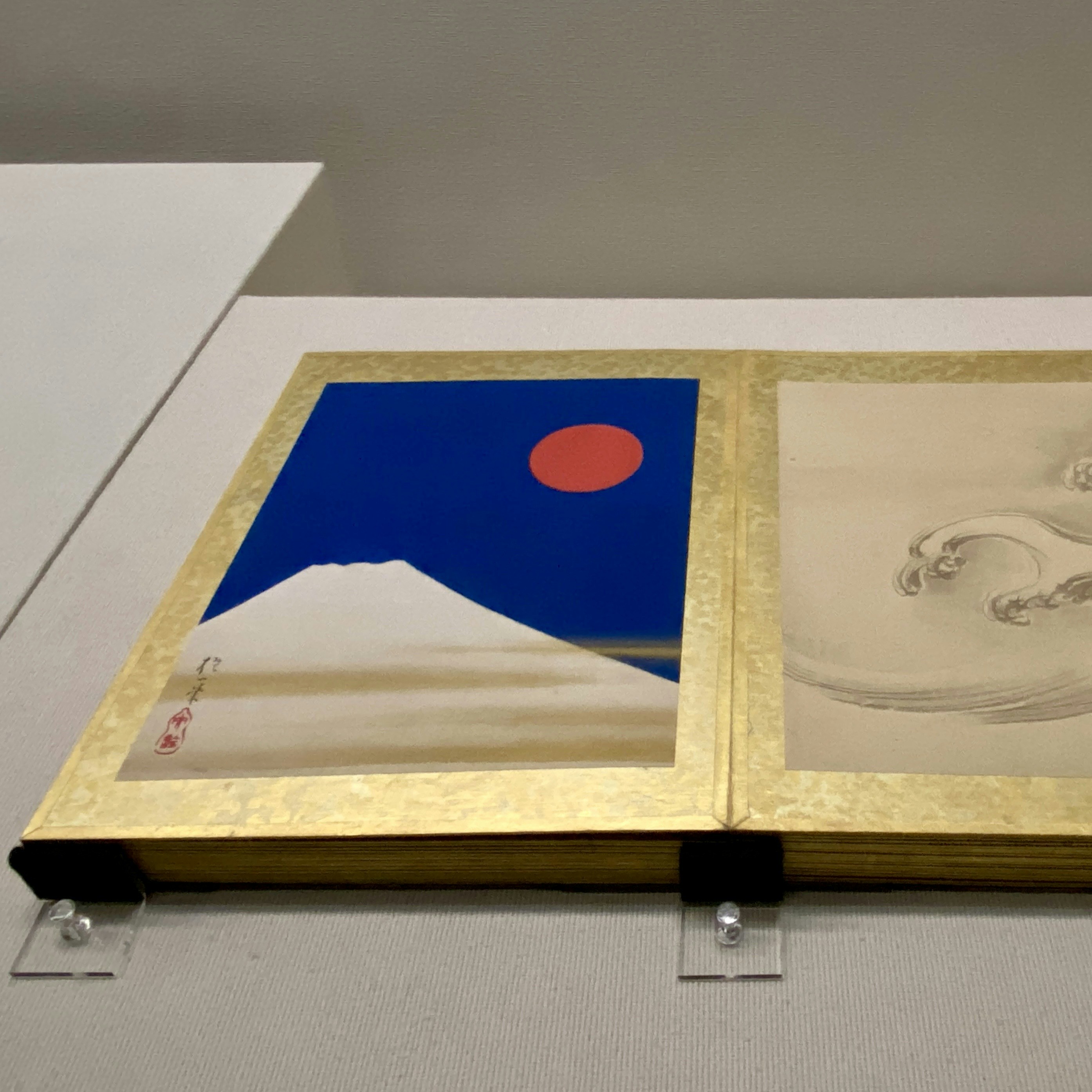 建物内1階にある美術館の入り口を抜けると、壮麗なホワイエを囲むかたちで4つの展示室がある。ギャラリー1「新春・日の出」には、正面に横山大観の《日の出》と滝和亭《松に鶴・梅竹に鳩図屏風》が並んで展示されている。初日の出を思わせる対策と金色に輝く屏風からは、新年のめでたい雰囲気が感じられるだろう。