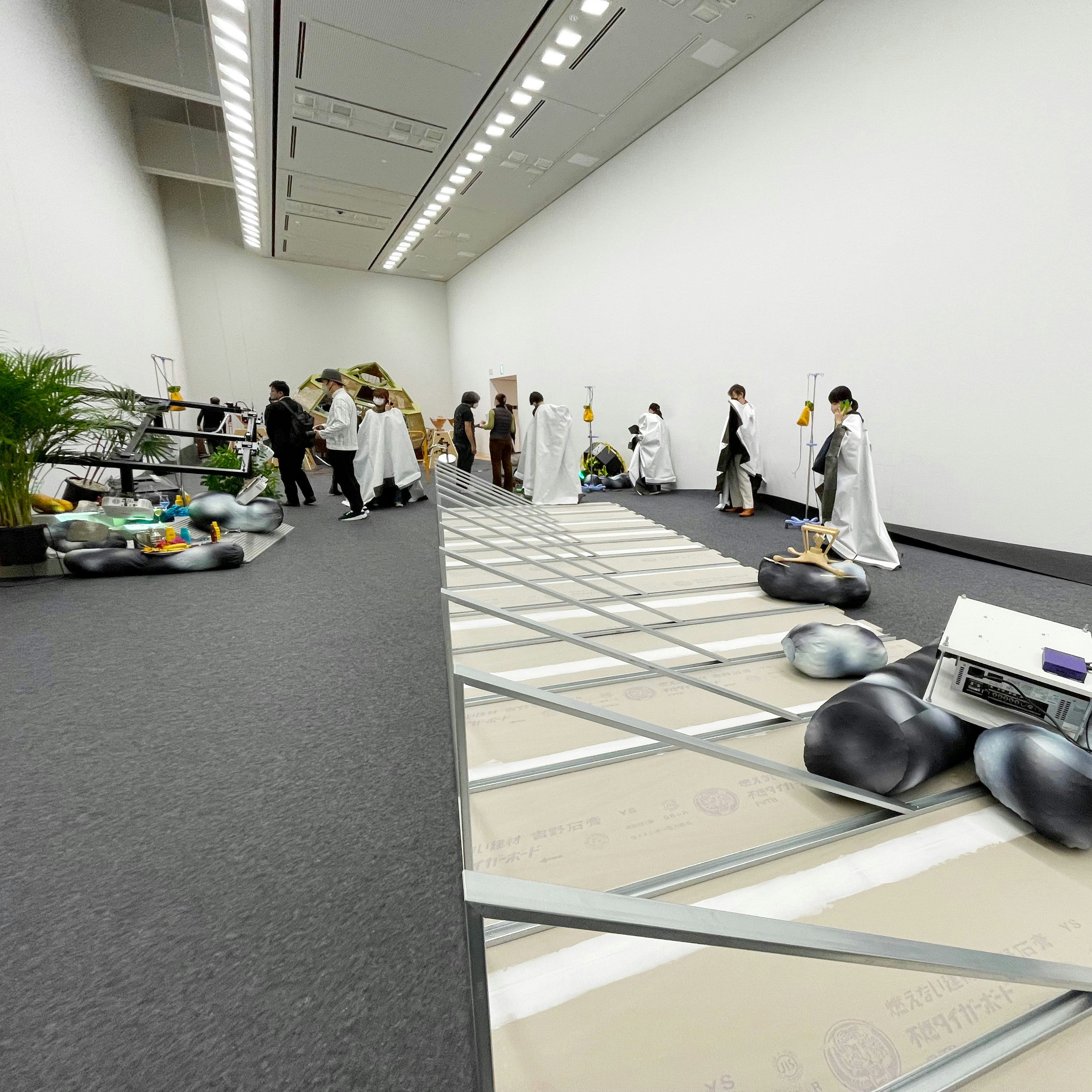 教習と称された音声に従い、参加者はロッカーに預けた荷物と引き換えにひとつの袋を手に入れる。袋には人がすっぽりと隠れるほど大きな白いマントが詰められており、鑑賞者はこのマントを身につけることで美術館という人工物に擬態しながら会場を巡ることとなる。美術館に来た鑑賞者が美術館のコスプレをする不可思議な状況が生じるのだ。