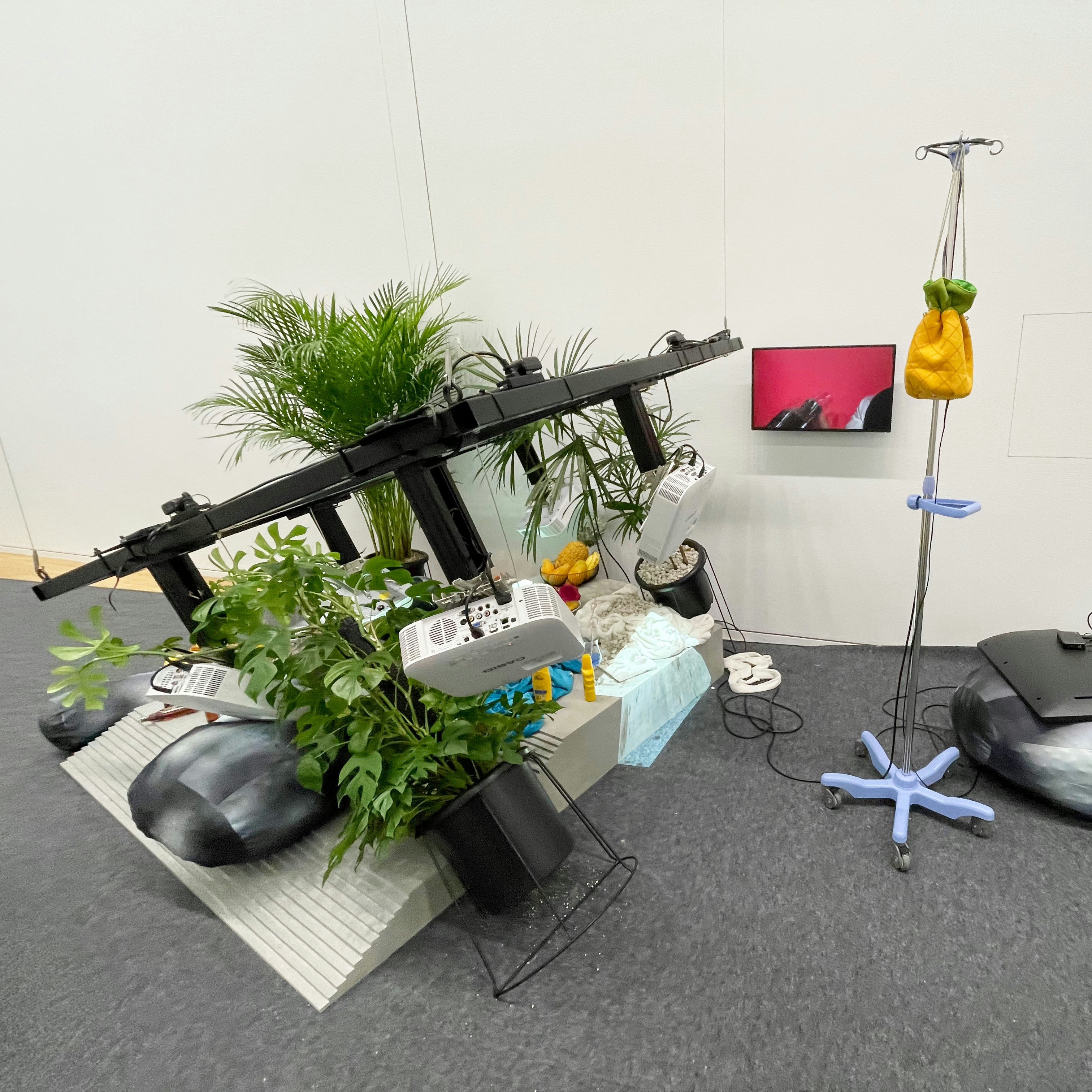 泉はこの状況を作品が「仮病」を使っていると述べた。機械やモニターは人間の手でON / OFFを要求されるのが通常であるが、ここでは作品自体が「自分は病気である」と意思表示をしているのだ。モニターが突っ伏しているクッションは作品の梱包材を模した形状であり、美術館という場所とのリンクを示している。