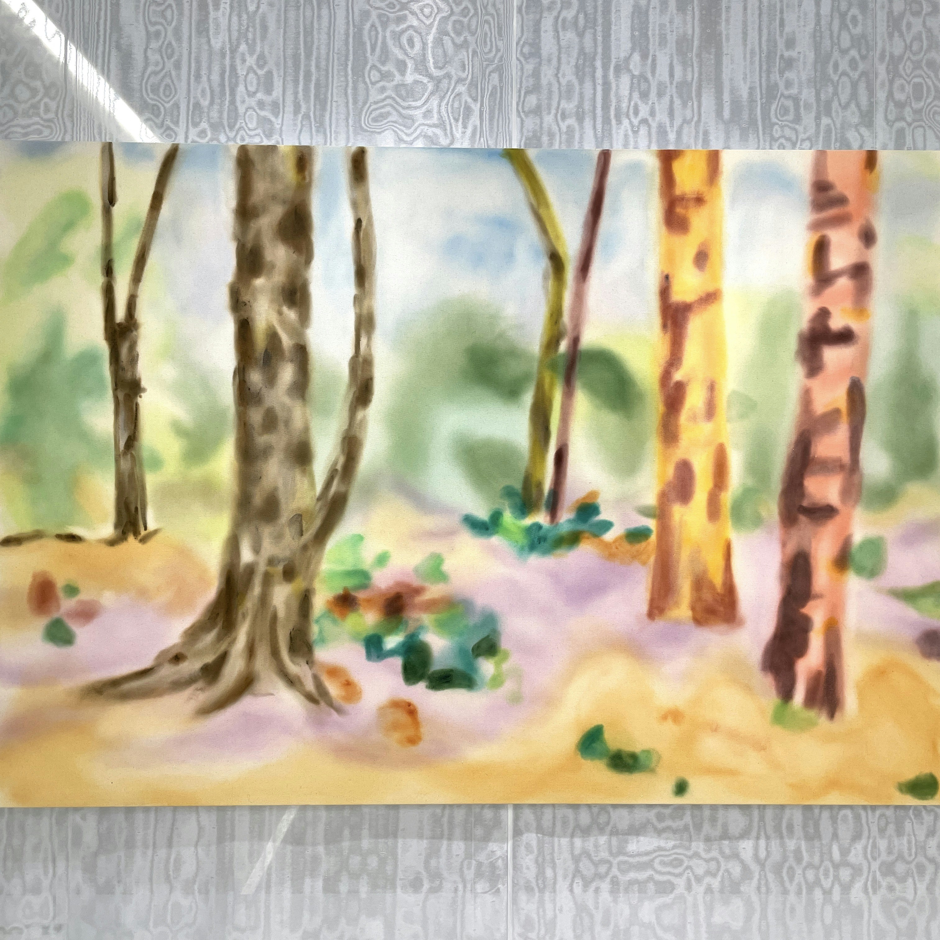 また、仙石原の森を主題にした新作では、赤褐色の幹肌が特徴的なヒメシャラの木々が描かれている。湿潤な土壌でしか育たないというヒメシャラの木や、太古の時代にカルデラ湖の底にあった湿地帯である仙石原の地も、水を扱う丸山の独特な表現手法と響き合っている。