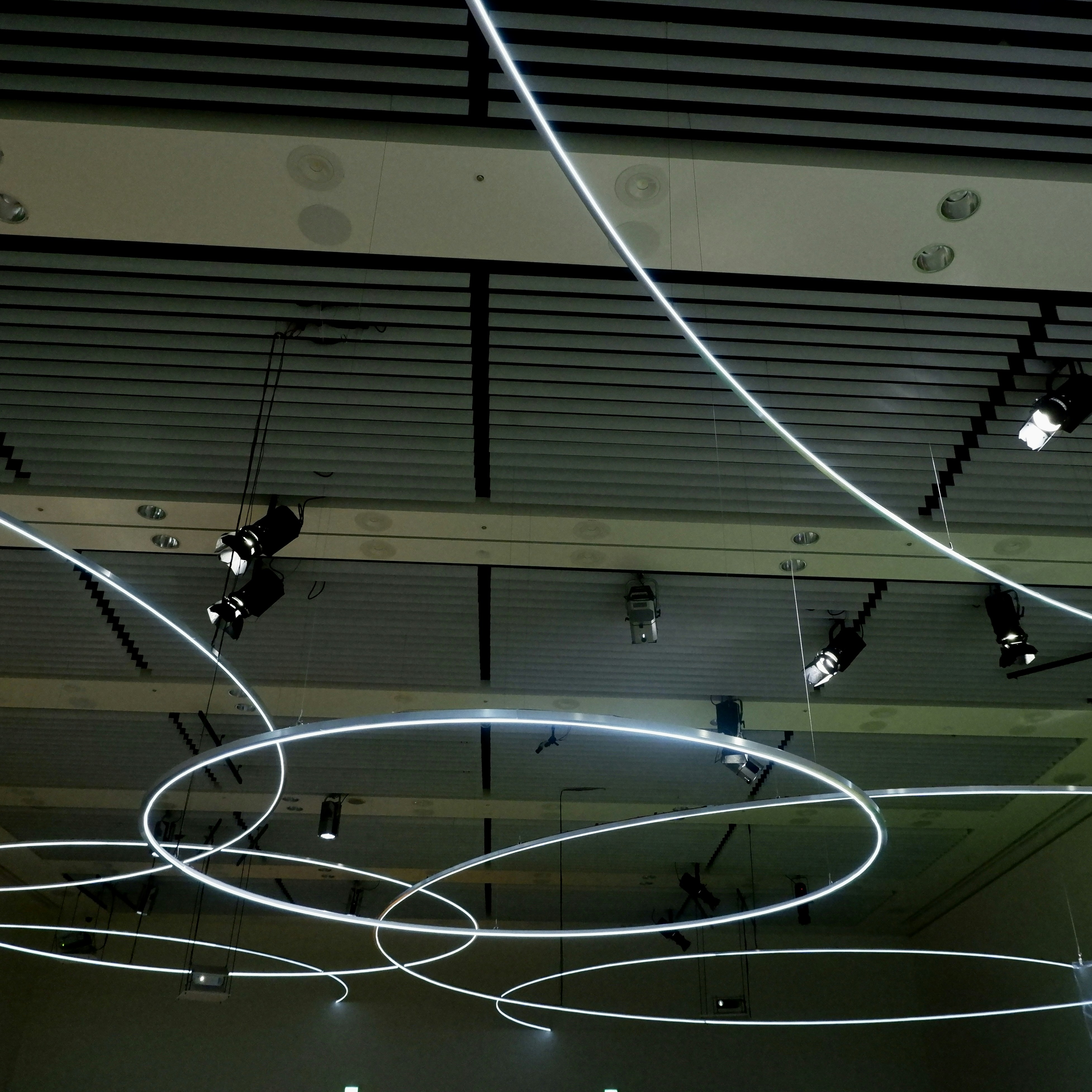 展示エリアごとの7つに加え、誰もが集えるスペースとしての輪を加えた8つのリングライト。これがそれぞれのリズムで明滅しながら、蛍の集団同期明滅のように影響しあっている。空間に動的な要素を与えるこのライトを、平井は「生きている天井」と呼んだ。