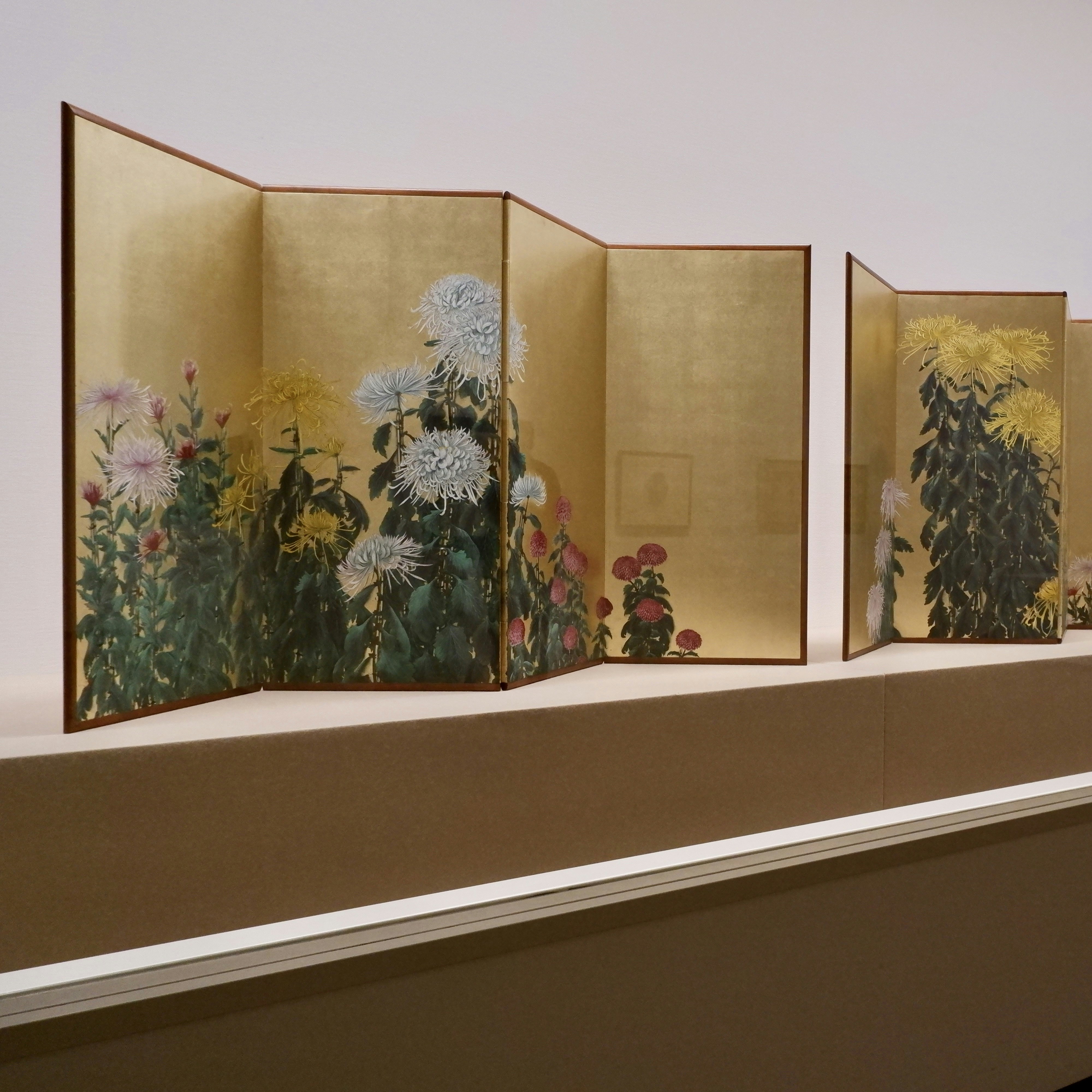 第二章「写実の探究―細密描写」の展示は、細密描写の極みともいうべき《菊花図》から始まる。屏風の金地にも負けない、色彩豊かで、近づくほどに迫力を増す菊の花。生命力と香気を訴える一輪一輪に目が奪われてしまう。
