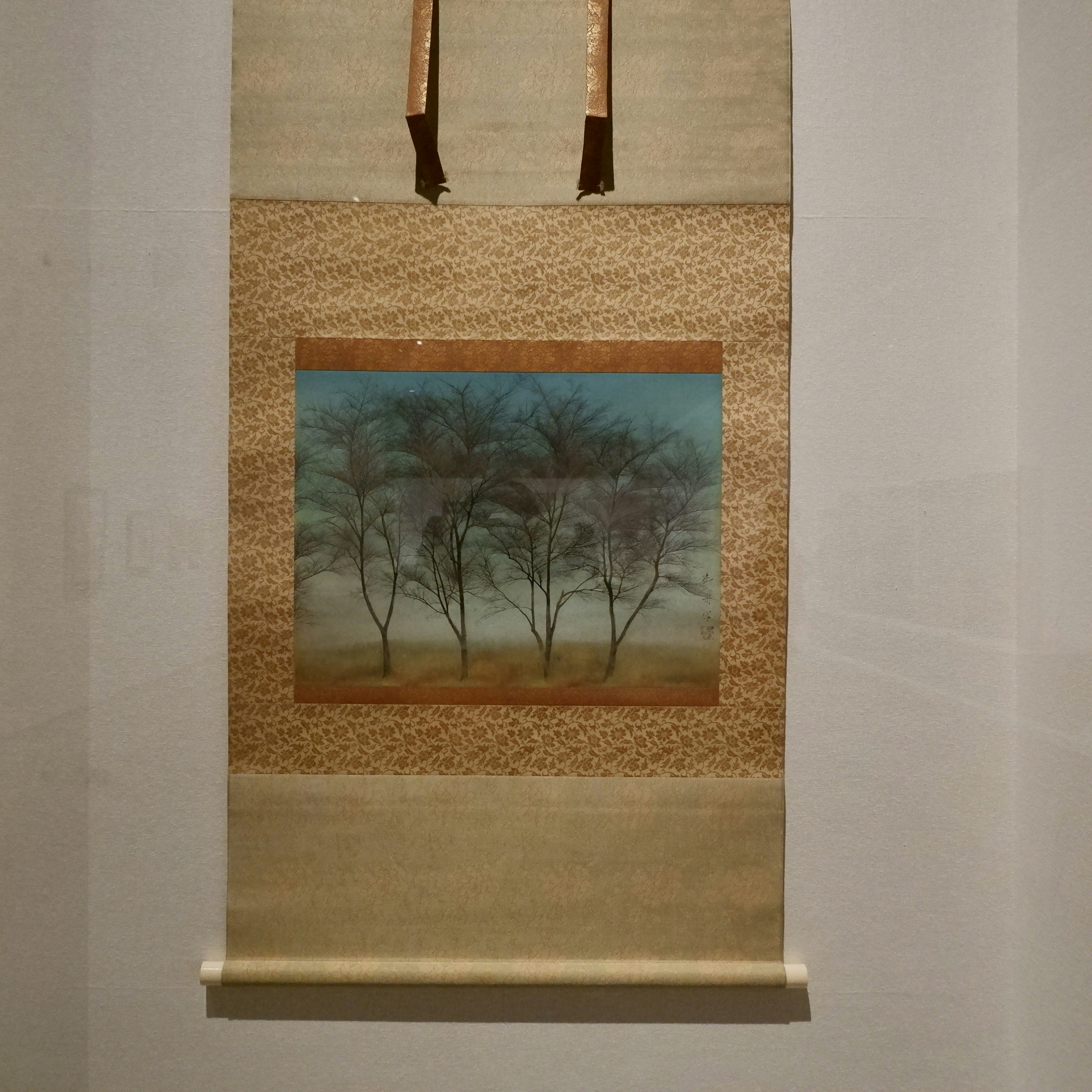 モノクロームの迫力を楽しめる《塩原渓流》が整然と並ぶ壁を越えると、重厚な赤が美しい《果物》、光を閉じ込めた黄と緑の《白葡萄と茶碗》、金地に重厚な色が冴えるダイナミックな構図の《秋茄子に黒茶碗》などの静物画が続く。