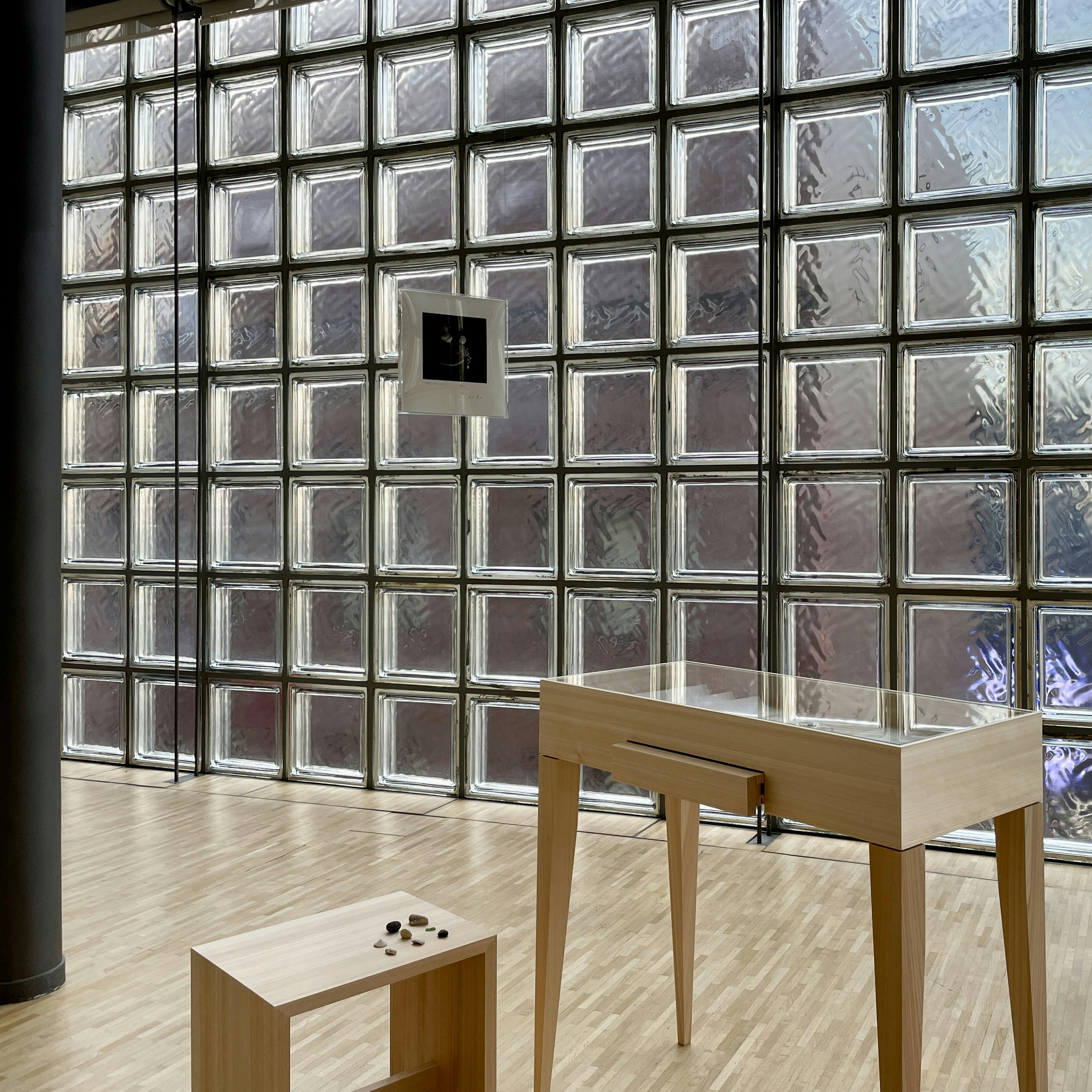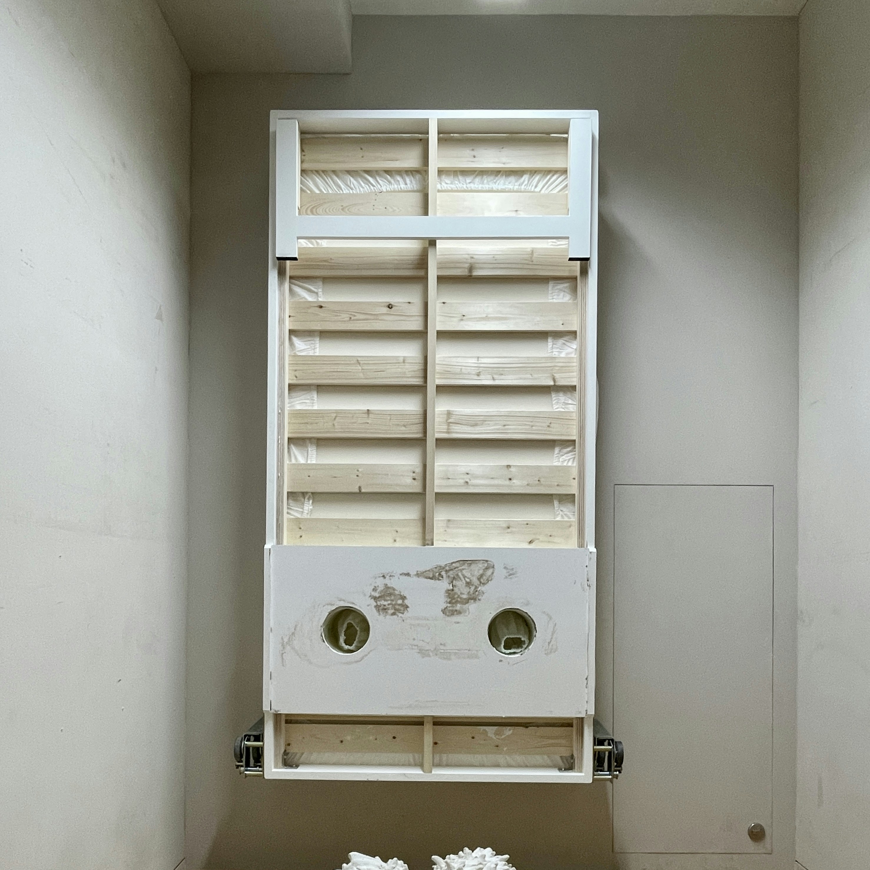 ボテラは本展で、キュレーターのカリン・シュラゲターと対話し、本展の内部に入れ子式で展示への干渉・衝突を試みた。例えば、会場の裏側に展示された《寄宿》は、壁にかけられた機械式のベッドや粘土による立体物からなるもの。ボテラはこのスペースで一晩寝て、ベッドに空いたふたつの穴から手を突き出し、眠っているあいだに手の無意識な動きをとらえてかたどったのがその立体物だ。