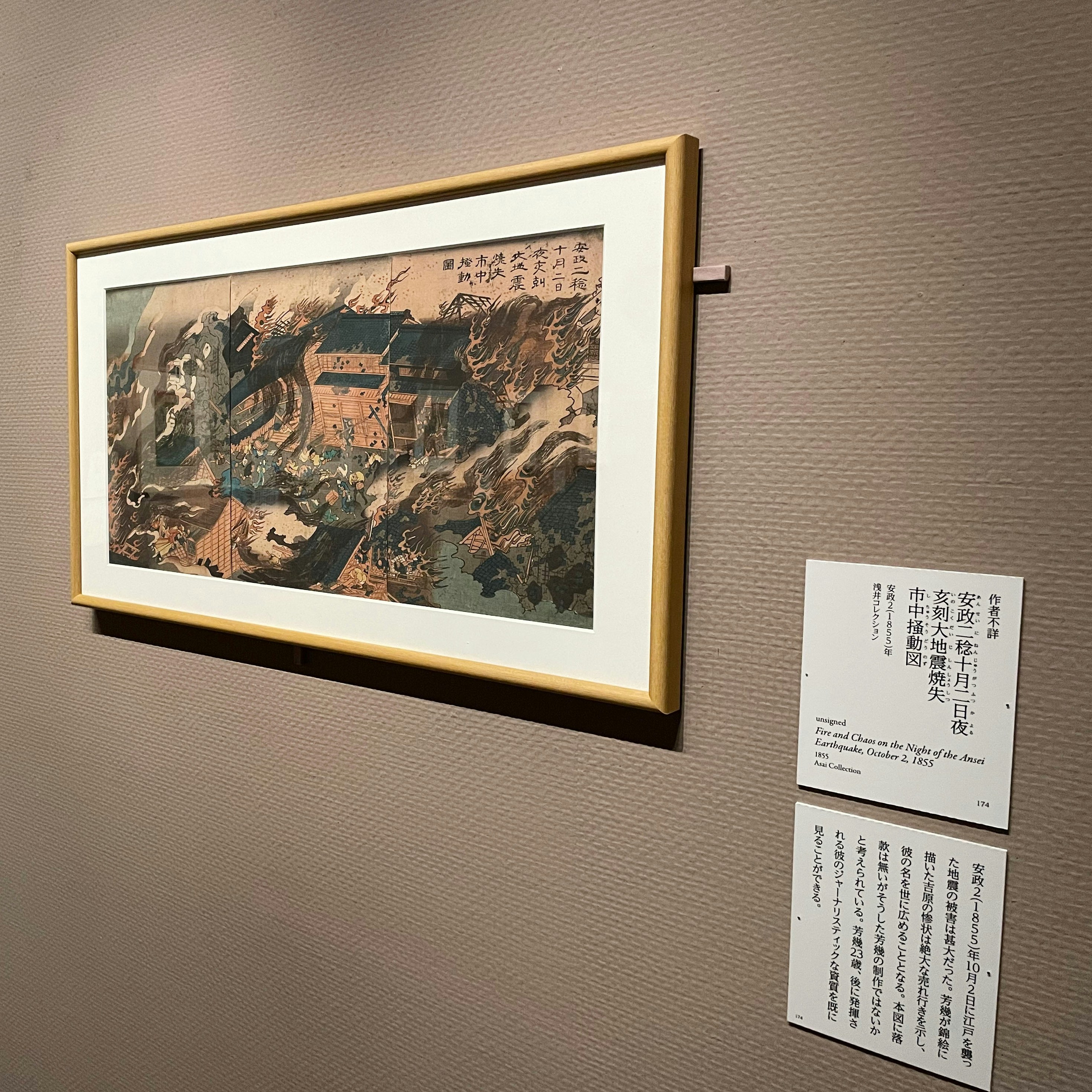本展では一部の章で、芳幾・芳年と同時代を生きた絵師たちの作品も紹介されている。会場には、幕末に開港した横浜の様子を描いた歌川貞秀による異国情緒あふれる「横浜絵」や、鉄道や建築など明治の文明開化をとらえた「開化絵」、光や影のうつろいを巧みにとらえた「光線画」で一斉を風靡した小林清親の作品などが陳列。これらの作品からは、浮世絵が時事を扱う役割となっていったこともうかがい知ることができる。安政の大地震を描いた《安政二稔十月二日夜亥刻大地震焼失市中掻動図》(1855)は作者不詳であるが、芳幾が23歳の頃の作品ではないかと言われている作品。この芳幾のジャーナリズムが、のちに発揮されることとなる。