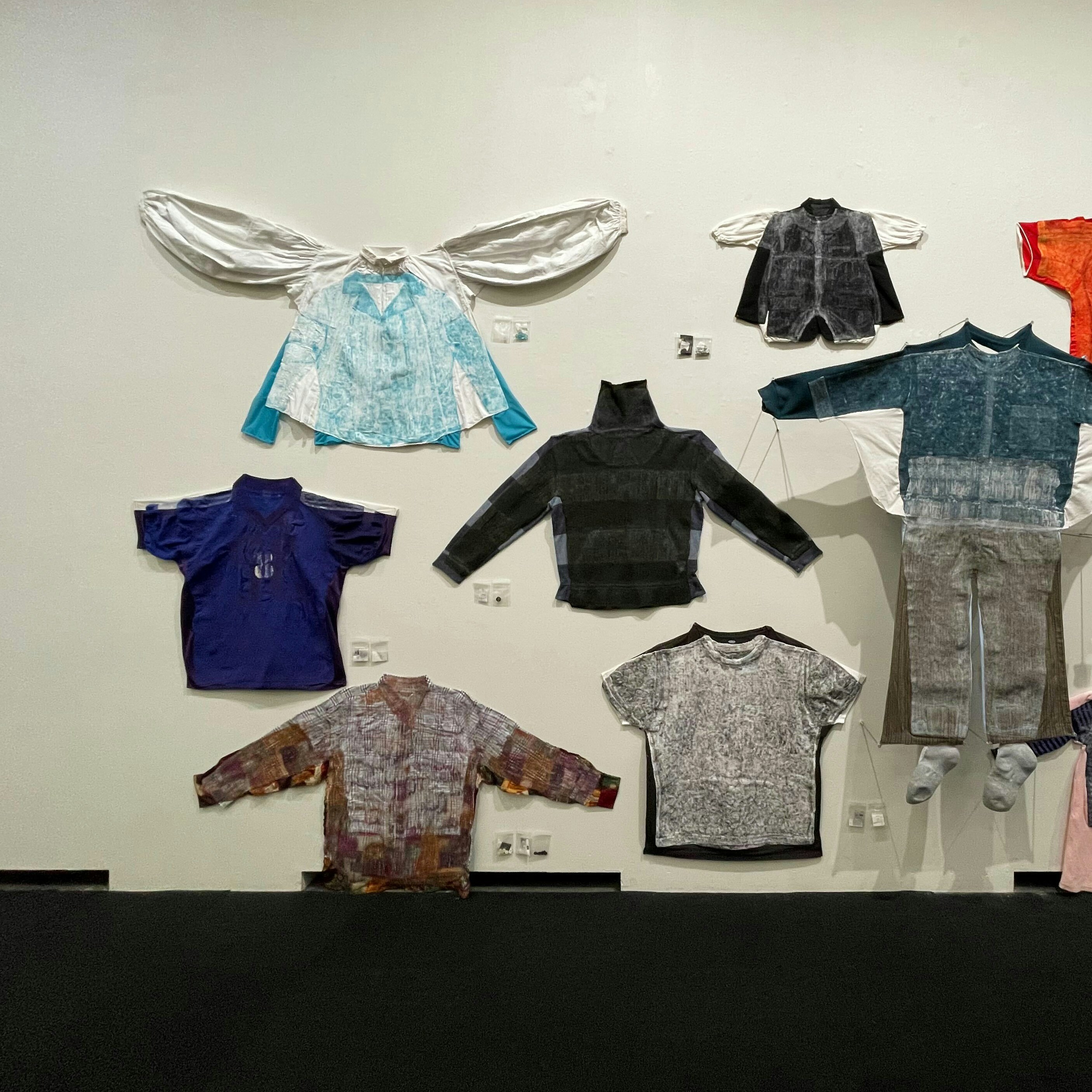 佳作には黒山真央と田中藍衣が選出された。黒山の《SIBLINGS》は2種類の古着がニードルパンチで穿たれ、互いの繊維が透けて見えるほど絡みあっている。これらは自身の良好とは言い難い姉妹関係を発想に生まれた「関係性の標本」だという。9組18人の衣服の様相からは、それぞれまったく異なった関係性が浮かび上がって見えることだろう。
