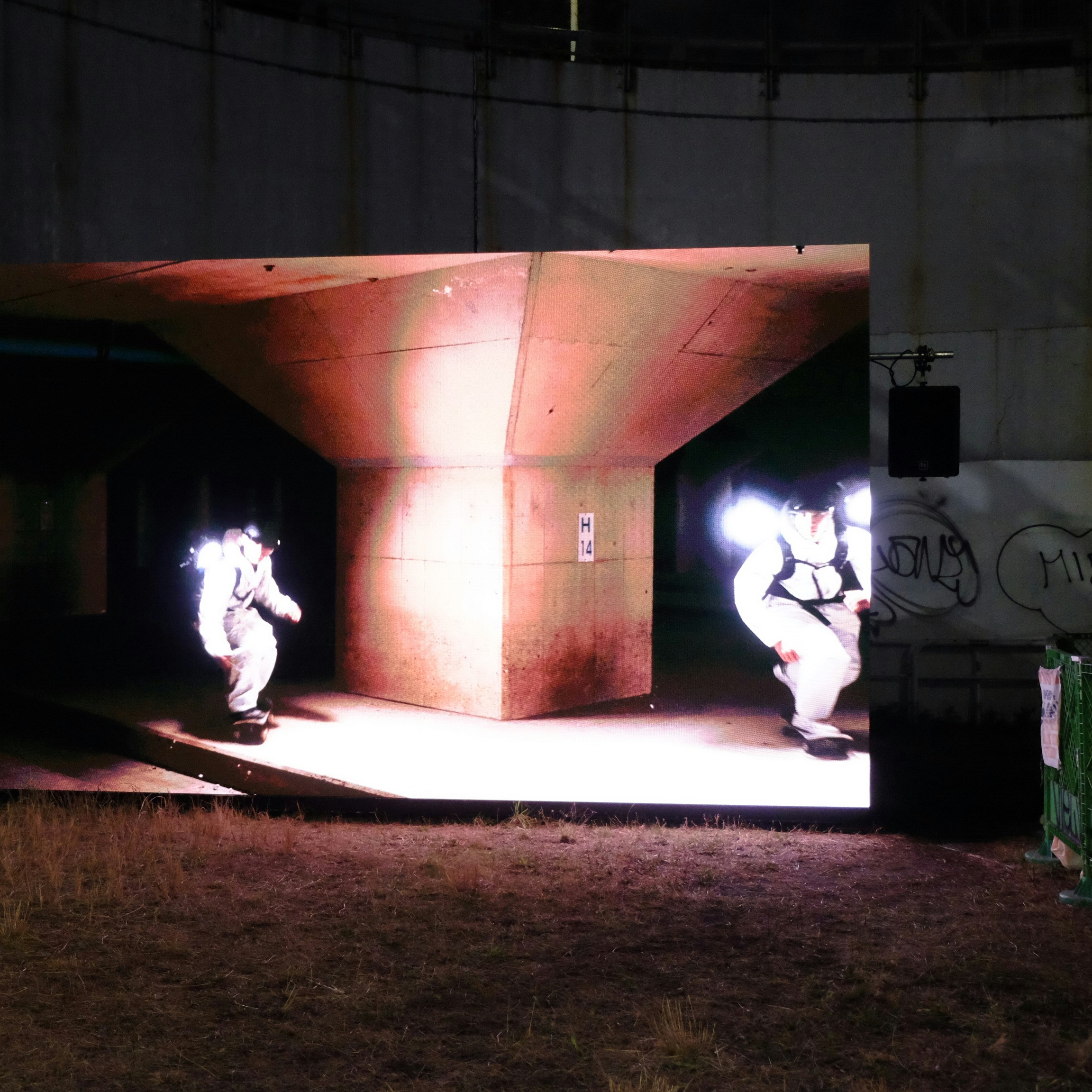 本作は東京の地下にある貯水池、浄水施設、地下の廃駅などで、スケーターが探索をする姿を撮影した映像作品だ。会場となる目黒観測井は、地下水位や地盤の変動を観測する施設。この施設の敷地に大型のモニターを設置して作品が上映されている。
