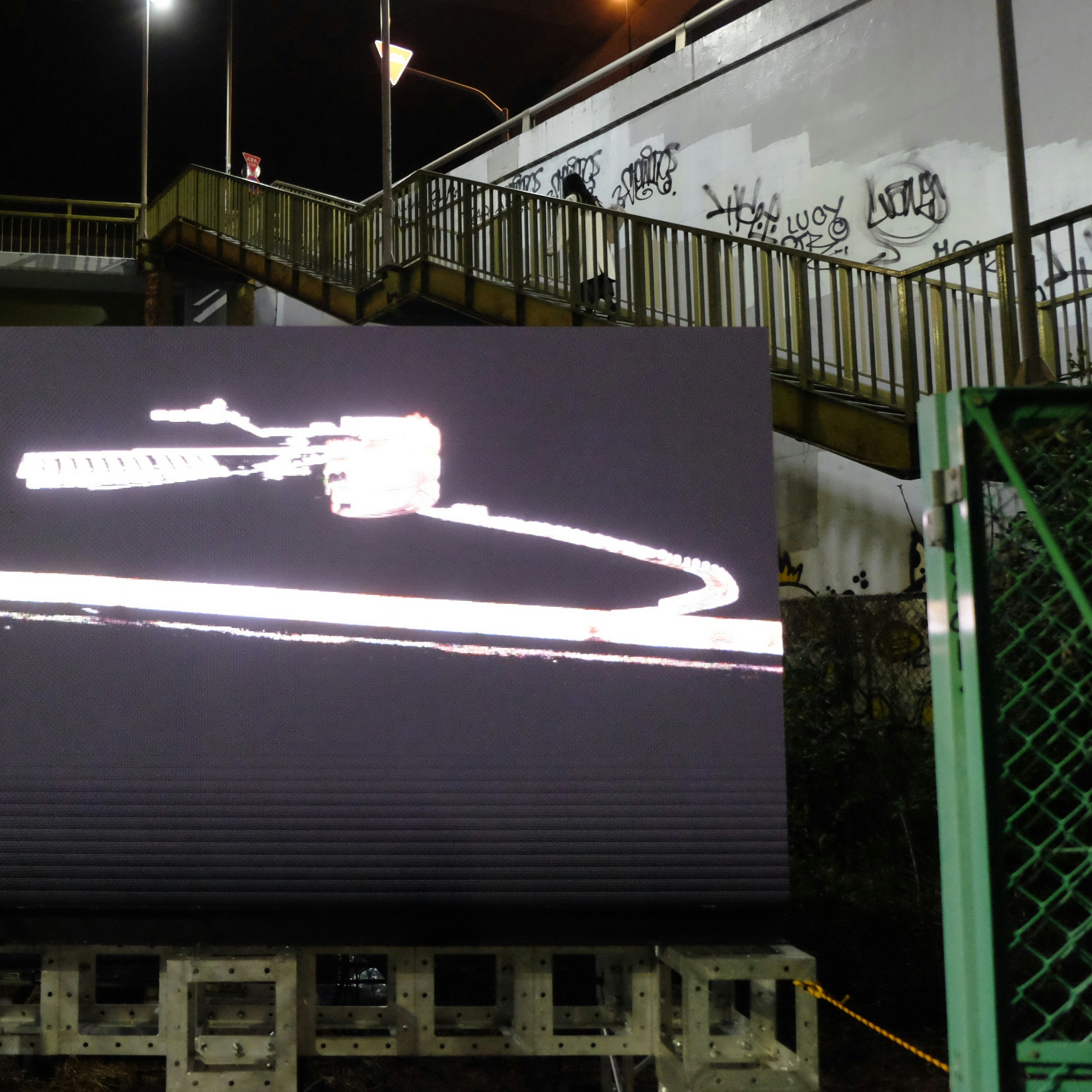 本来は立入が禁止されている空間に、作品を媒介として誰もが侵入することができ、自由に鑑賞することで都市の持つ可能性を感じられる展示となっている。なお、モニター展示のため、周囲が暗くなった夜の鑑賞をおすすめしたい。