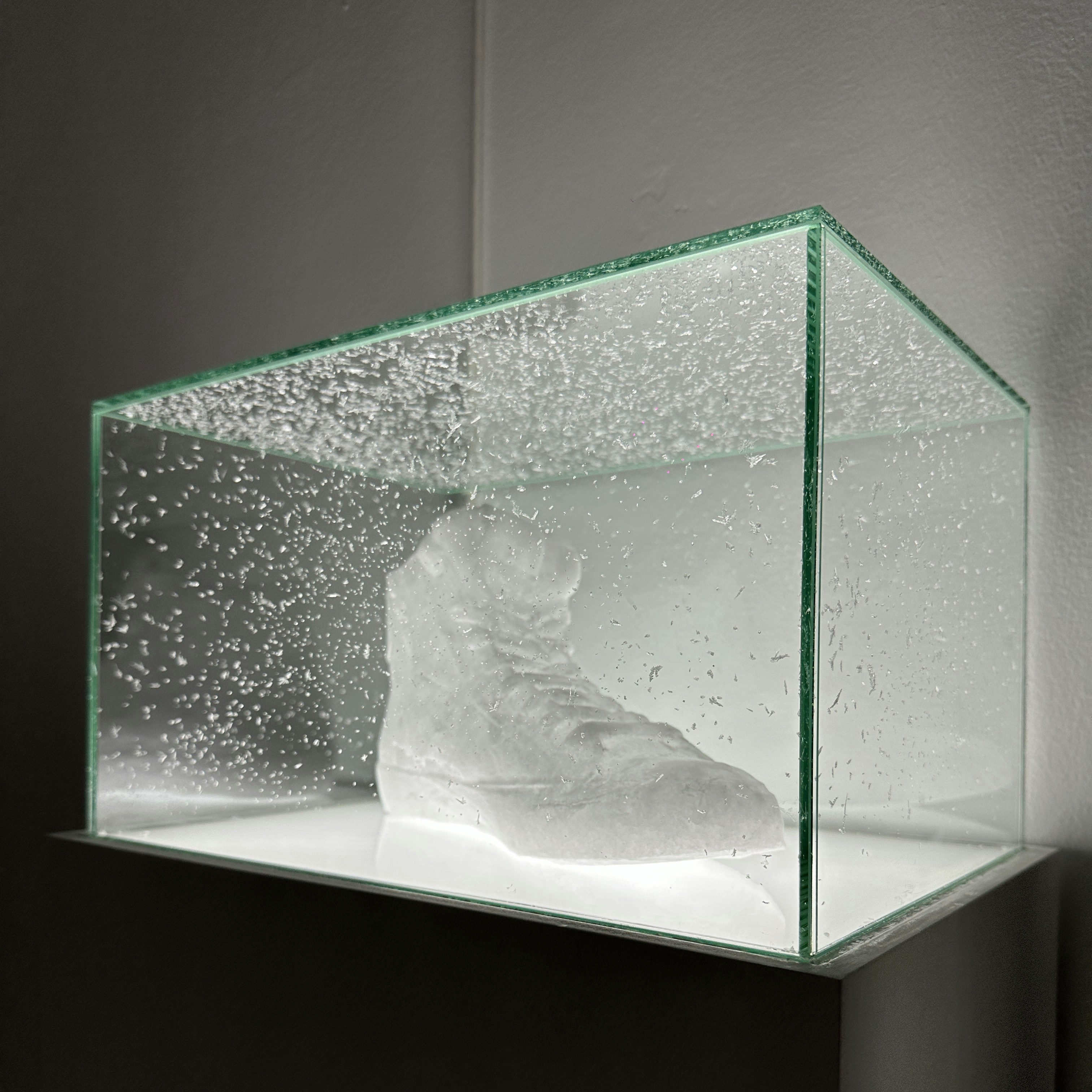白い光に包まれた一角は、宮永愛子の新作《Root of Steps》。六本木に居住通勤する人の靴を模した場所性を備えた彫刻を、常温で昇華する性質を持つナフタリンを用いて複数制作し、インスタレーションとして展示。昇華した後もどこかで再結晶化する素材の特性が、儚いだけではない、「見えないけれどどこかに存在する」という心強いメッセージを纏わせている。