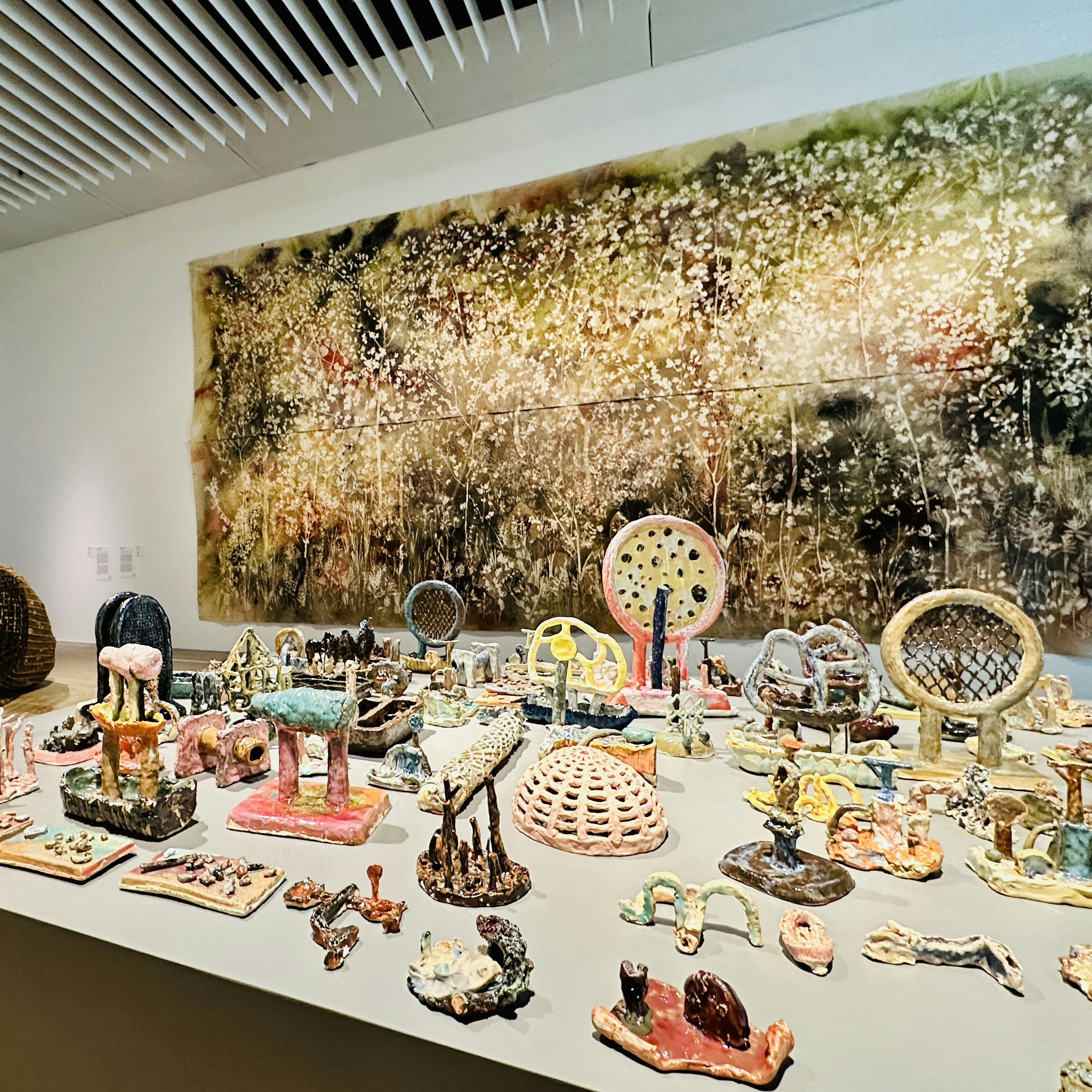サム・フォールズの展示作品は、葉っぱと染料を用いてステンシルのようにしたキャンバスを風や雨にさらして描くという実験的なもの。その左手には瀬戸桃子の美麗な映像作品《プラネット ∑》、手前には梅津庸一による陶器の作品群《黄昏の街》が展示されており、生物や物質の微細な質感を見ながら自らを取り巻く大きな世界に思いを馳せるような作品の数々を楽しめる。