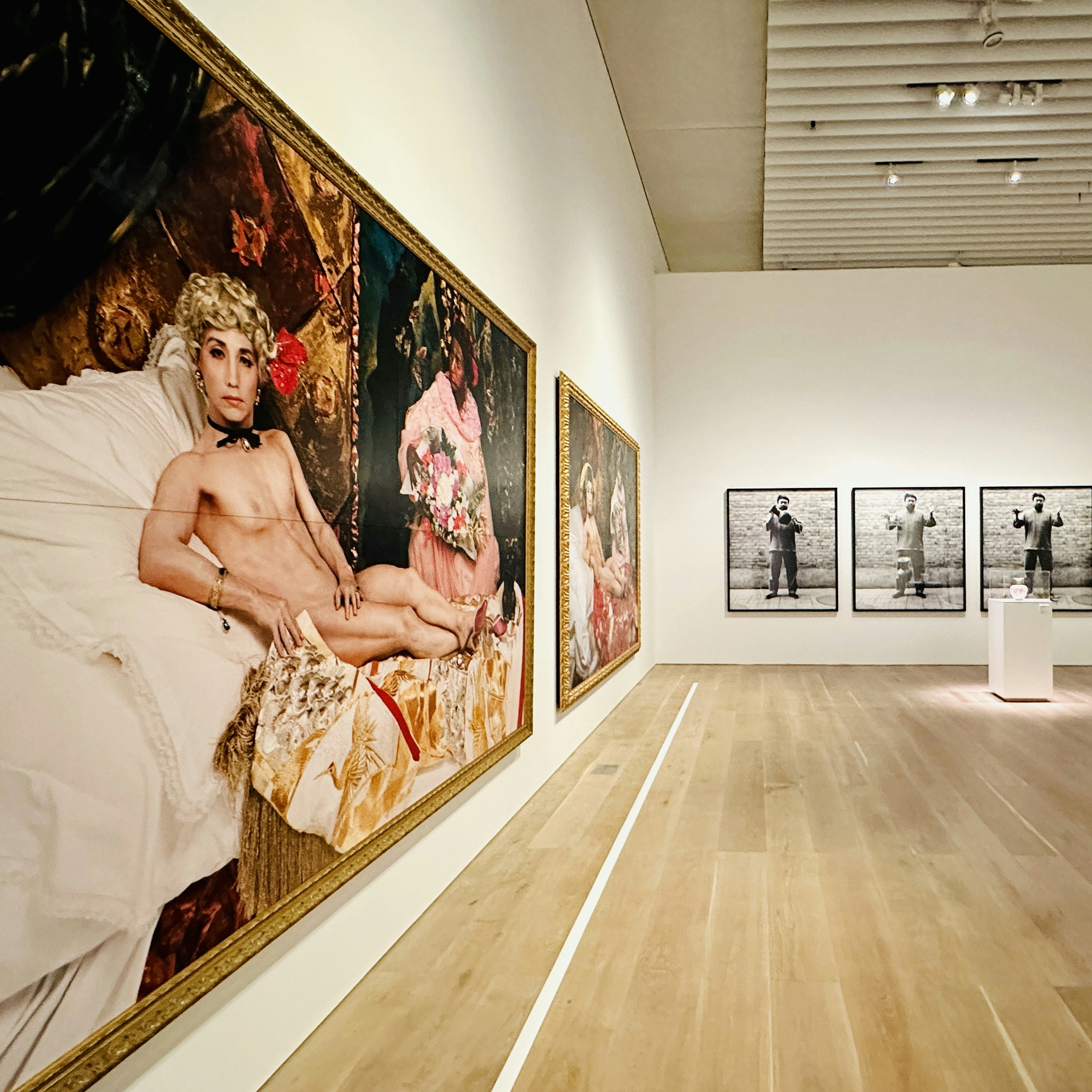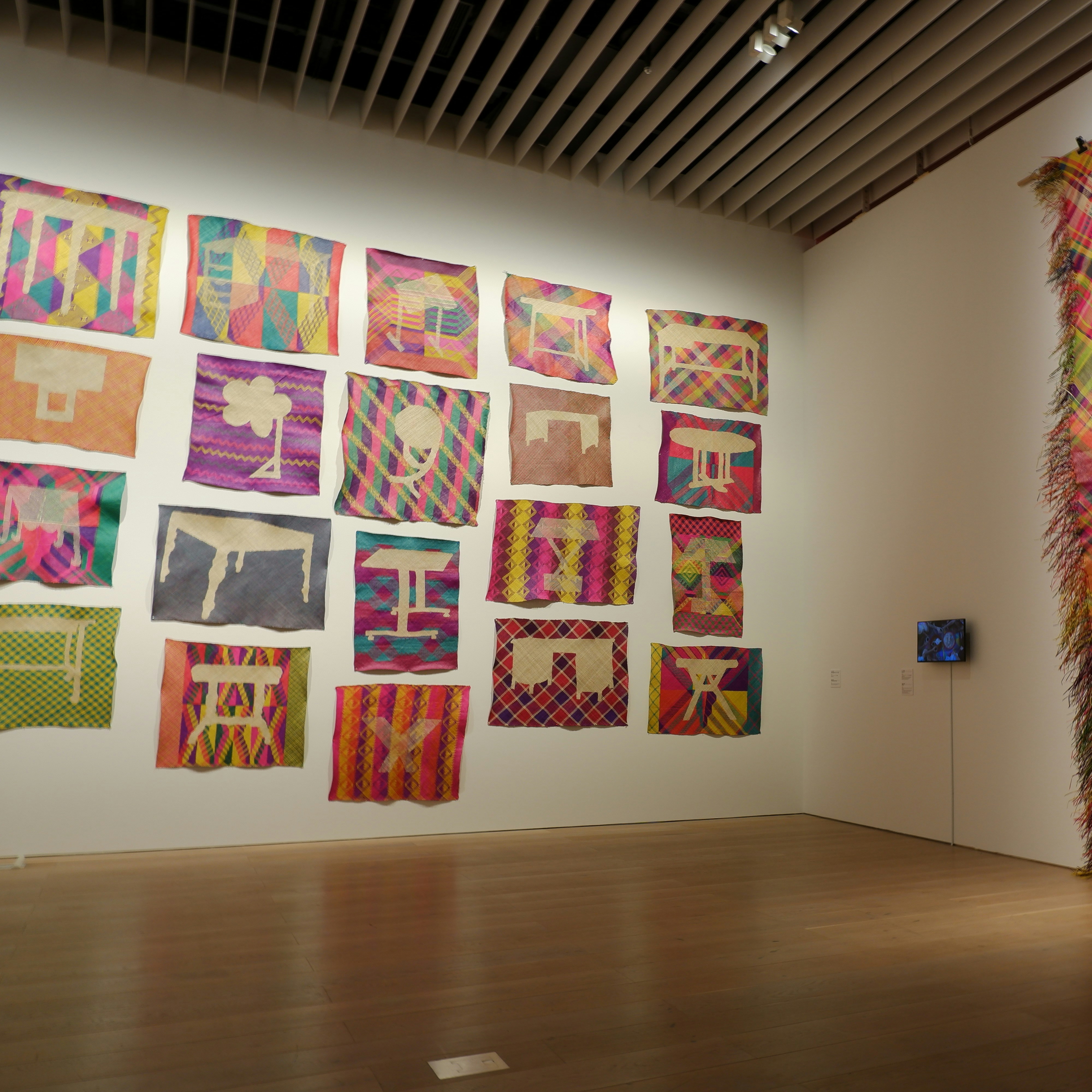 迫力あるサイズと色彩の《肖像(双子)》《モデルヌ・オランピア 2018》は、日本人男性である自分自身の身体を「異物」として西洋絵画に挿入してきた森村泰昌の作品。マットにテーブルの図像を織り込んだイー・イランの作品《 TIKAR/MEJA(マット/テーブル)》は、生活から支配がはじまり搾取に至る植民地支配を象徴しているという。