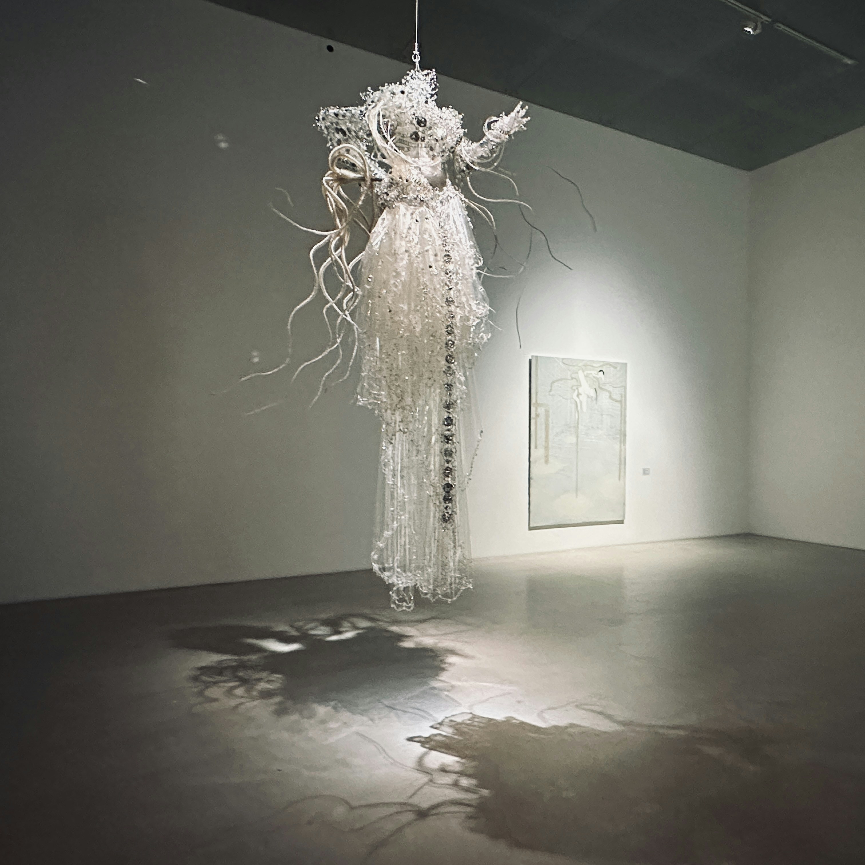 SFから古典的な神話に至る様々な文化的引用をもとに、未知のものへの恐怖や身体とテクノロジーの関係を表現するイ・ブルの「モンスター」シリーズや、樫木知子が幽霊的な存在をモチーフとして扱った《タイルの部屋》、死の装飾が植物的に増殖する青木克世の白磁の白一色による《予知夢XXXII》、ヴィクトリアンジャケットを解体した両袖部分に独自の文様を縫い、失われた身体を想起させる沖潤子の《ひばり》など、幽霊的な形を持つもの、あるいは幽霊のように形が崩れていくものが並ぶ。