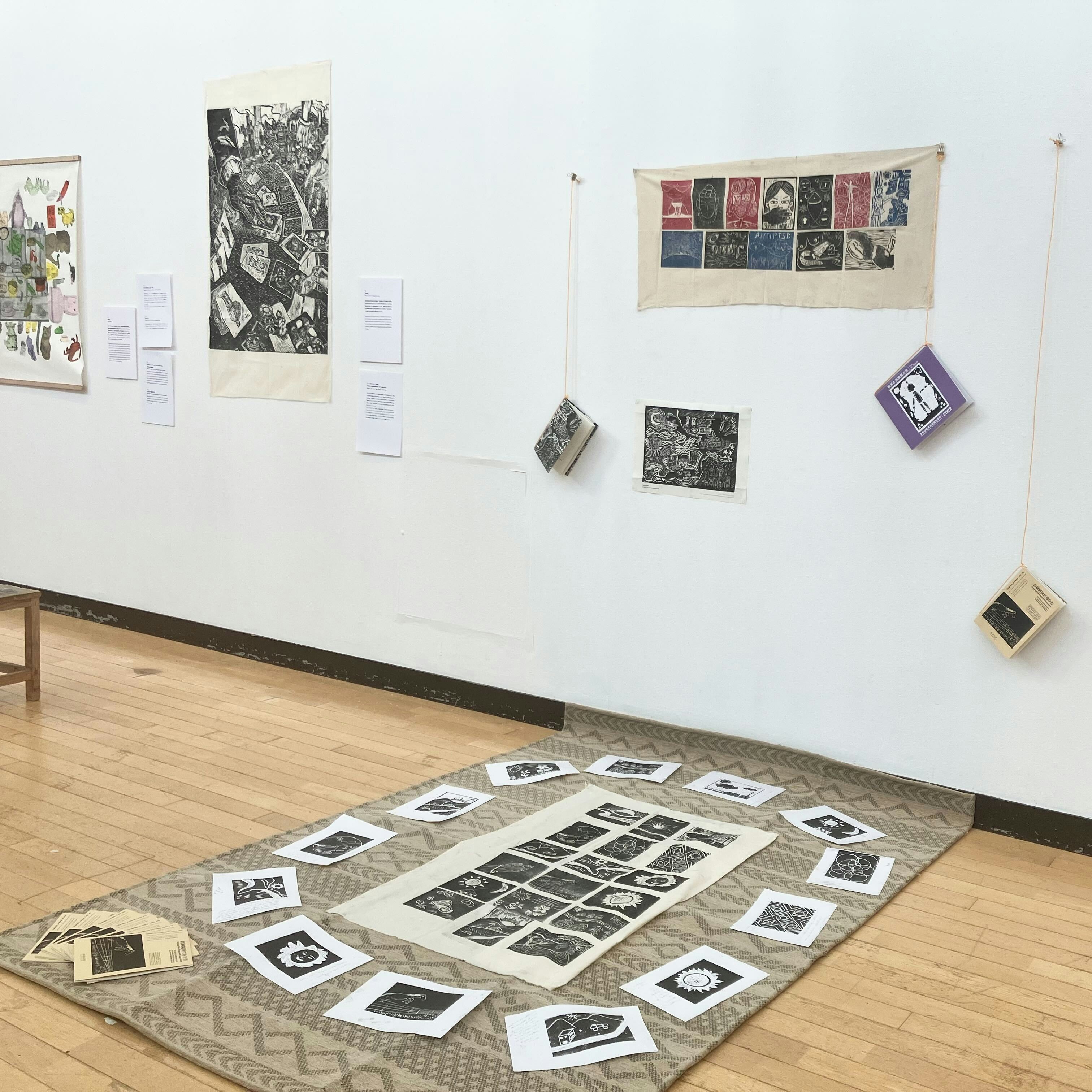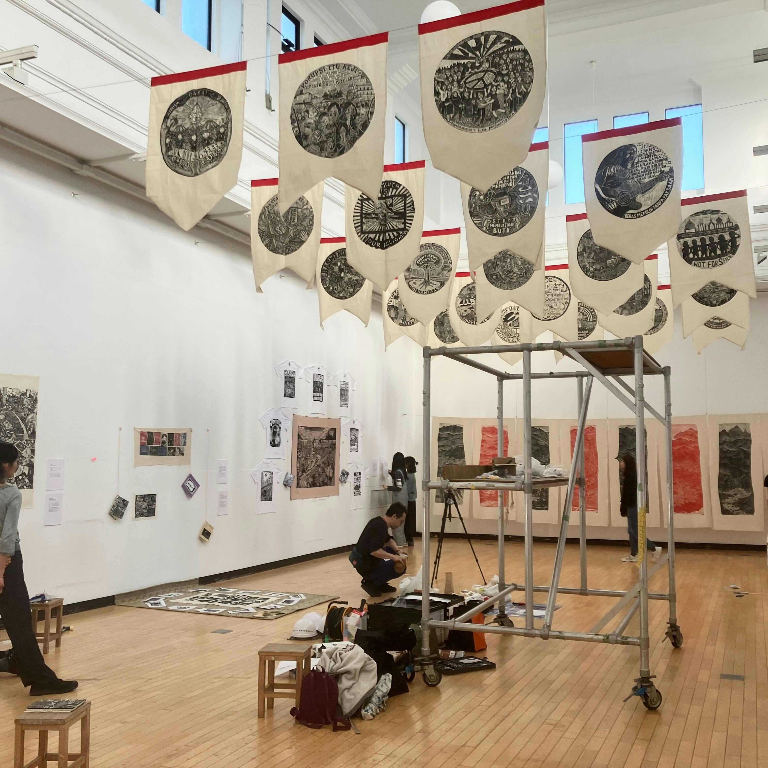 設営会場では、本展キュレーターのひとりである吳君儀が見学の学生らと質疑応答を交わしている最中であった。学生の「なぜ油画などのペインティングではなく木版なのか」という質問に対し、吳は「メディアとしての木版画の良さは、美術を専門に学んでいない人々にとっても扱いやすい点にある。色のコントロールもしやすく、インパクトのある図版を生み出せる。中国や日本における版画は歴史深いものだが、東南アジアではメディアとしての手軽さが魅力となっている」と述べた。