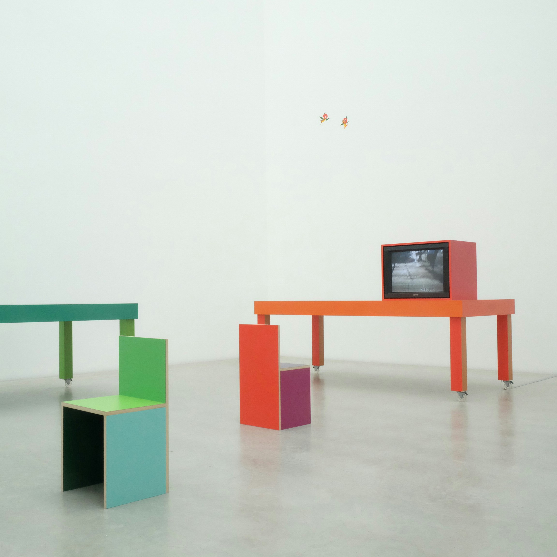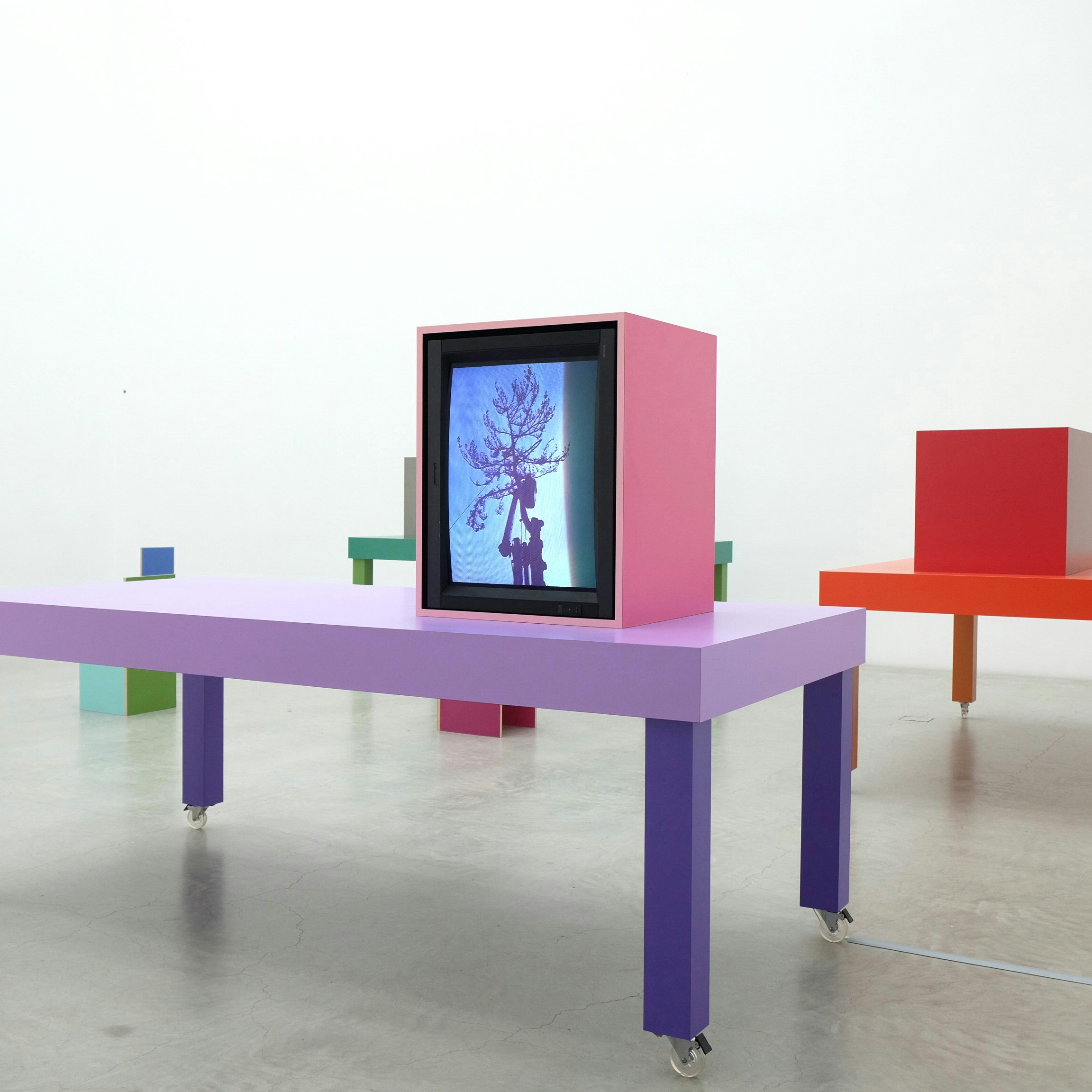 約12メートルの高さの壁と、天井からの採光が特徴的な展示室8。カラフルな什器と組み合わされた5つのブラウン管モニターが、自然光に照らされながらダ・コルテのこれまでの映像作品を上映している。過去20年間にわたり手がけてきた映像作品のなかから、選りすぐりを集めたというこの展示。「腰を据えてじっくりと鑑賞してほしい」とダ・コルテは語る。