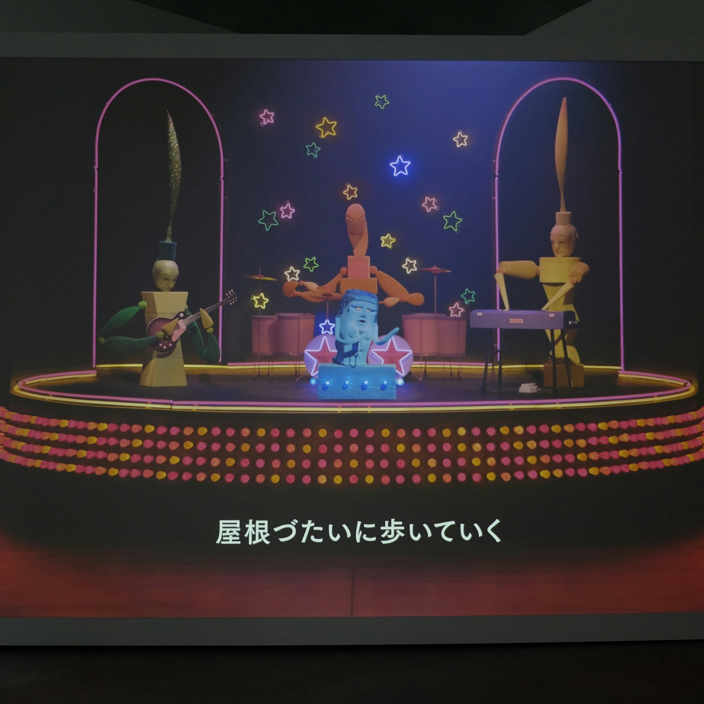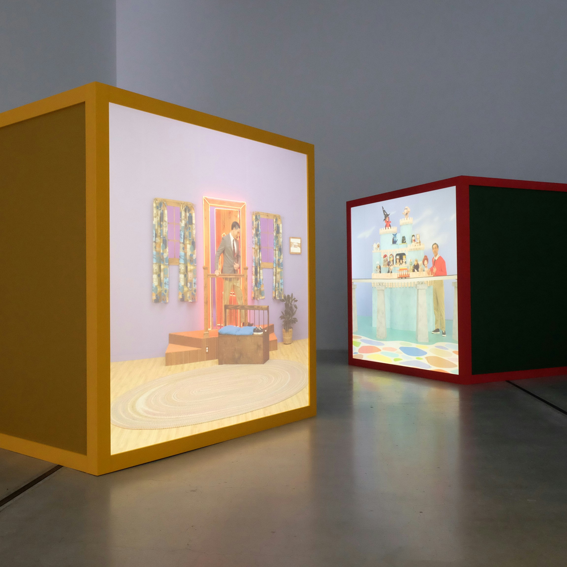 展示室11では、4つのモニターで57の映像を上映する《ゴム製鉛筆の悪魔》(2019)を展示。これらの映像の題材となっているのは30年以上続いた教育番組「ミスター・ロジャースのご近所さんになろう」や子供向け人形劇「セサミ・ストリート」、誰もが知るアニメーション作品「バックス・バニー」などであり、そこに込められた無数の引用がアメリカという国の肖像にもなっている。