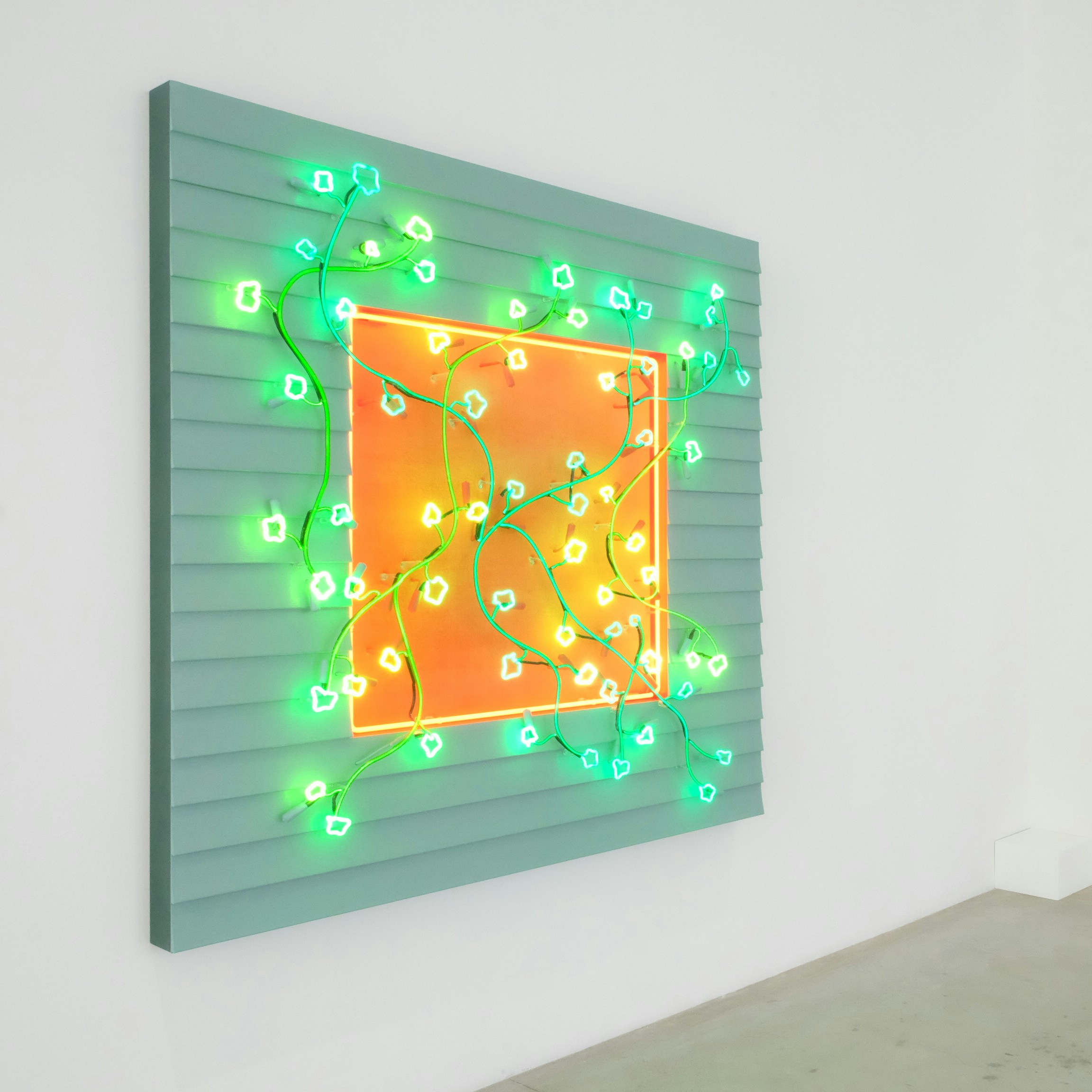 展覧会はネオンの光と窓に写り込んだその姿によって成立している作品《最後の一葉》(2022)から始まる。ダ・コルテは本作について次のように解説した。「この展覧会の始まりであり、結びとなるのが本作だ。本作は葉が落ちればまた芽吹くという、季節の円環の理を表している。ツタは時間の流れを表し、生きていき死んでいくという思いが込められている」。