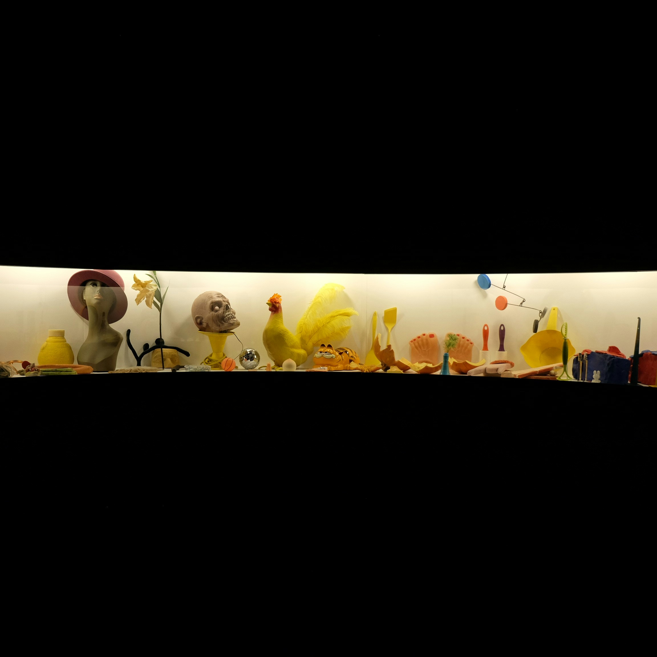 内部に足を踏み入れるとガラスケースがあり、その中には誰もが見たことのあるキャラクターの人形や、日常目にする道具などが並んでいる。本展で上映された映像作品に登場するものも多く含まれており、それらをダ・コルテの映像の断片としてケースの中で展示することで、その記号性が強調されている。
