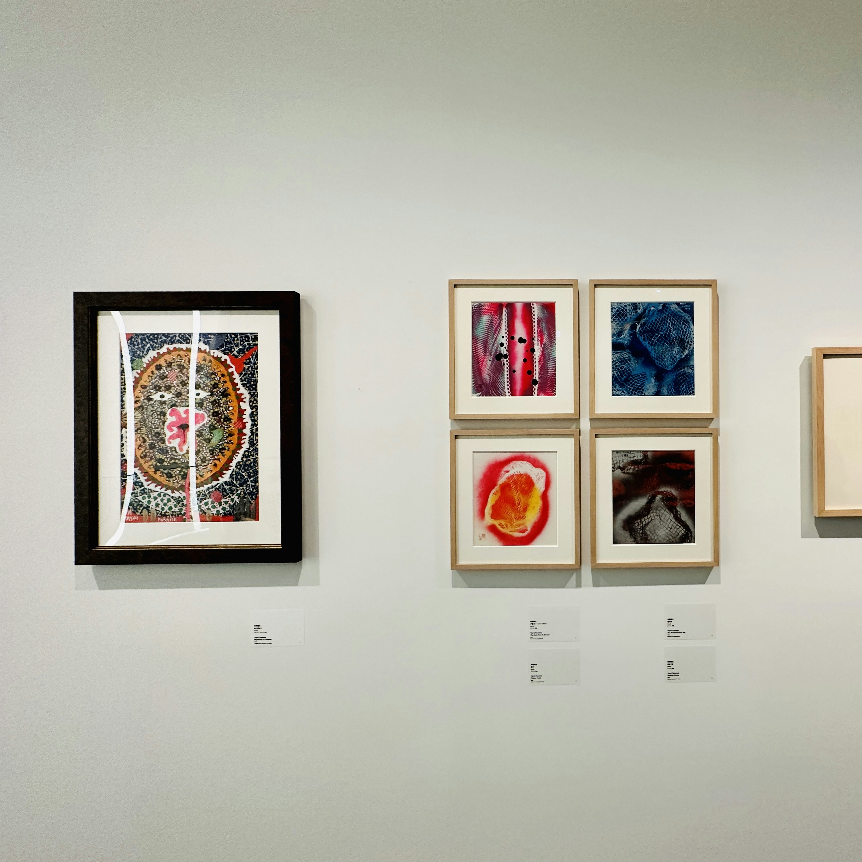2階に上がると、60年代から73年の帰国後、そして90年代前半までの作品が並ぶ。60年代に制作された、網目に覆われたキャンバスやマネキンなどは、サイケデリックにも通ずる視覚効果を生み出している。なお、このフロアでは70年代と90年代の平面作品4点が世界初公開されており、これらにもサイケデリックな視覚的特徴を見出すことができる。