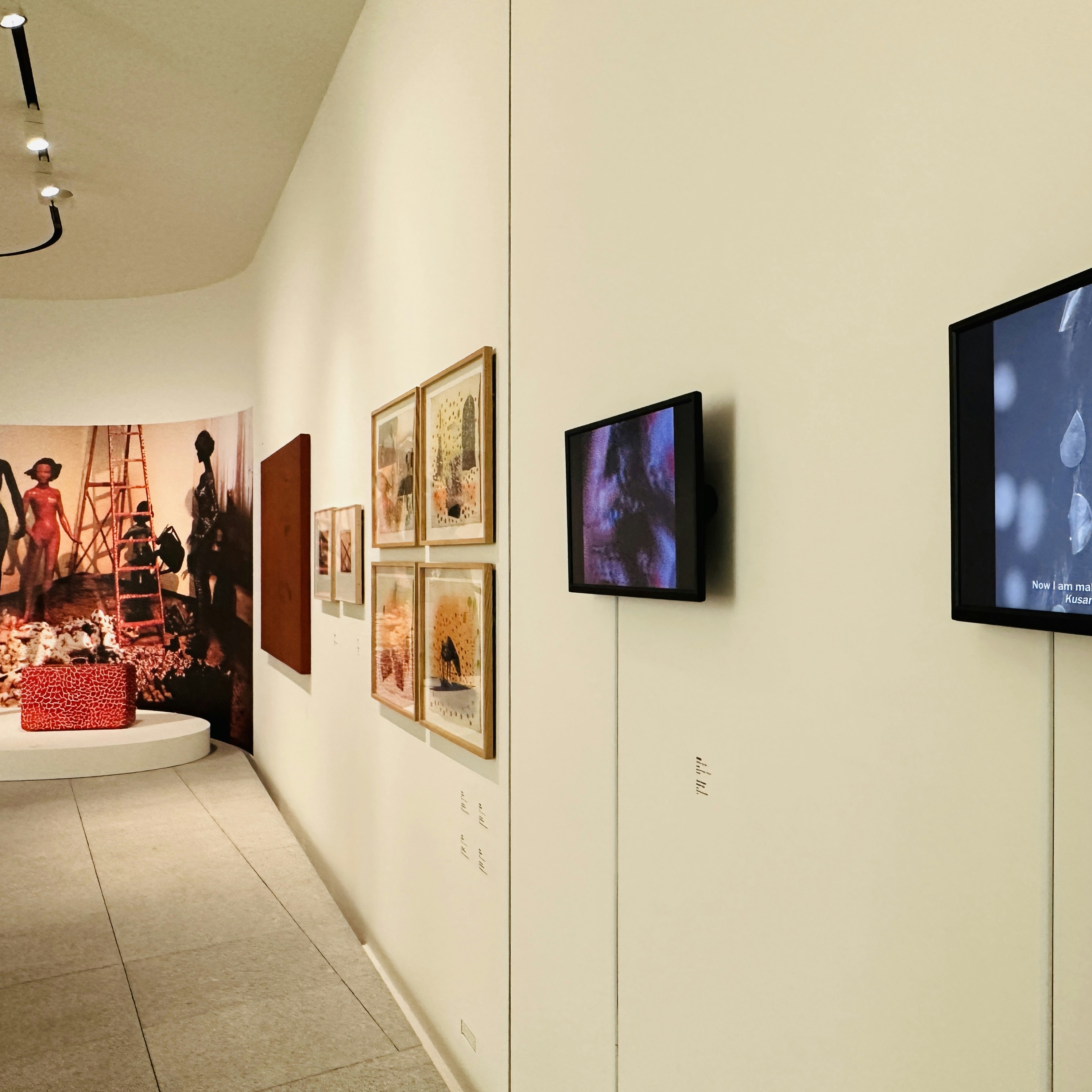 1階エントランスでは、草間が60年代後半にニューヨークの個展で発表した六角形のミラールームのシリーズ最新作《平和への願望はひとつひとつ輝くばかり》が初公開。万華鏡のように激しい様々な色の光が明滅する強烈な視覚体験は、サイケデリックな没入感をもたらすものだ。なおこの作品の隣では、67年に撮影された映画『草間の自己消滅』が放映されており、浮遊感のある独特のサウンドがさらなる陶酔感を与える。