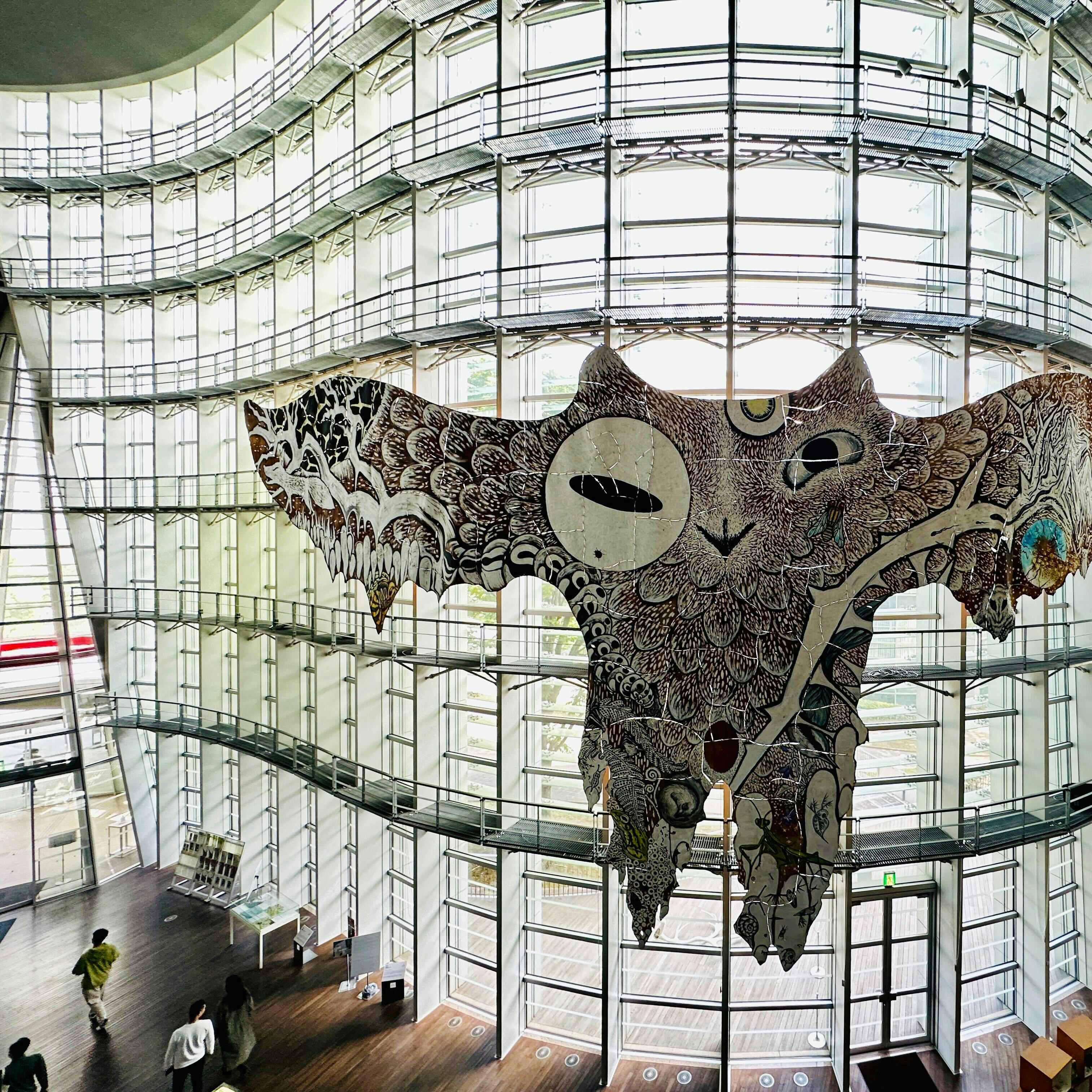 国立新美術館にはメインプログラム・アーティストのひとり、鴻池朋子による「いきもの」たちがその姿を現している。サイトスペシフィックな表現を用いて、美術館のなかだけではないアートのあり方について問い直し続けている鴻池は、2021年に角川武蔵野ミュージアムの外壁に1年間取り付けられた《武蔵野皮トンビ》を再展示。同作は縫製した床革に水彩で描いたものだが、1年間の屋外展示を経て、そのかたちが当初より変化している。このトンビは鑑賞者に「自然は時とともに変化していく」ことを改めて伝えてくれる役割を担っている。